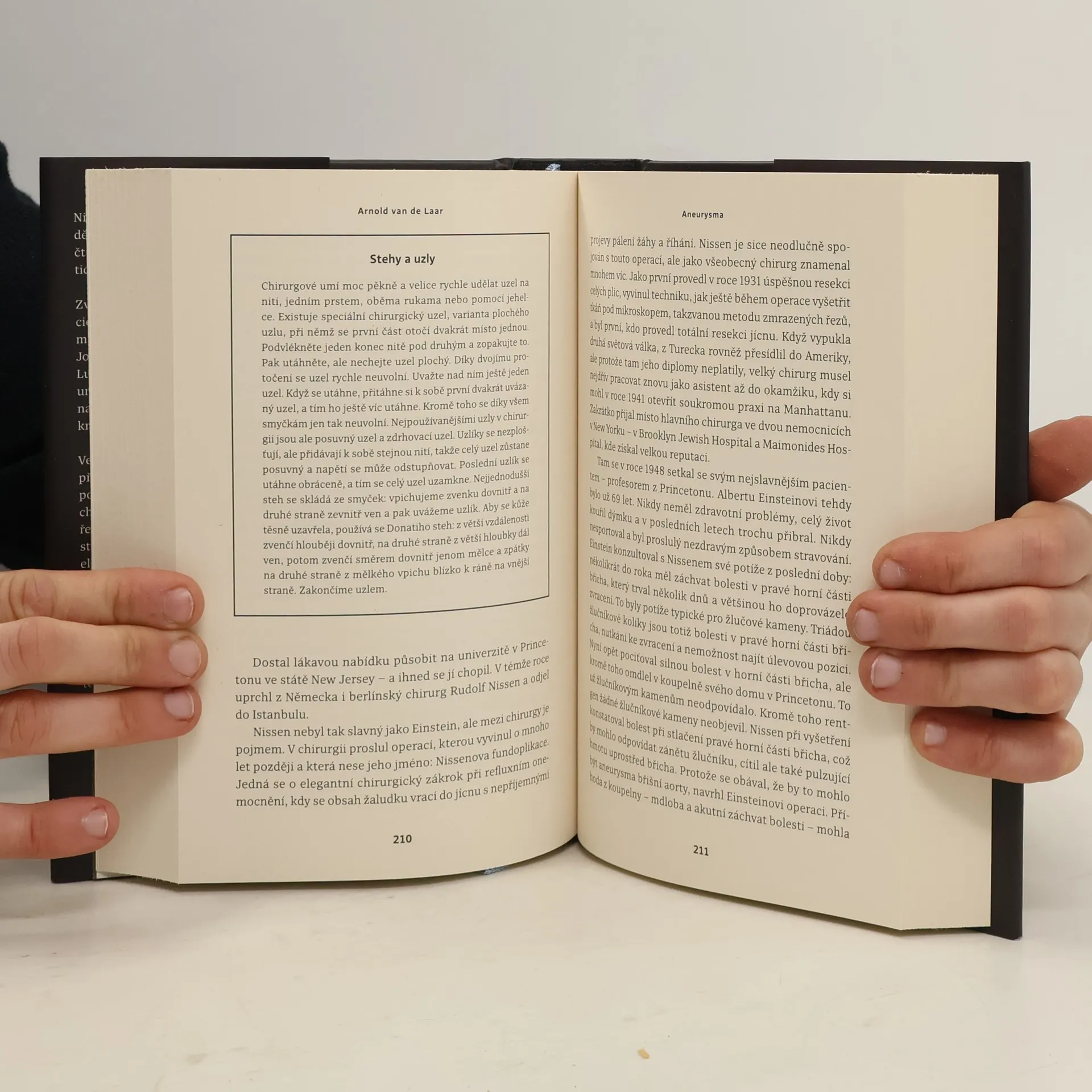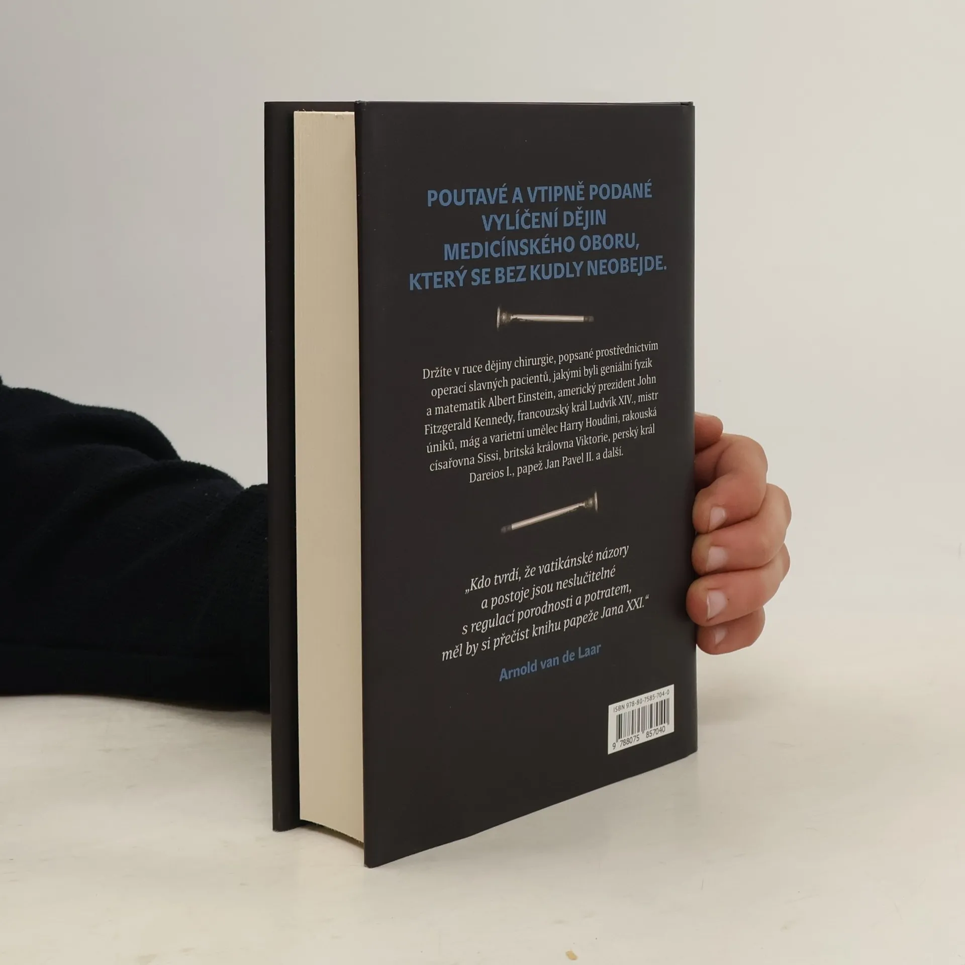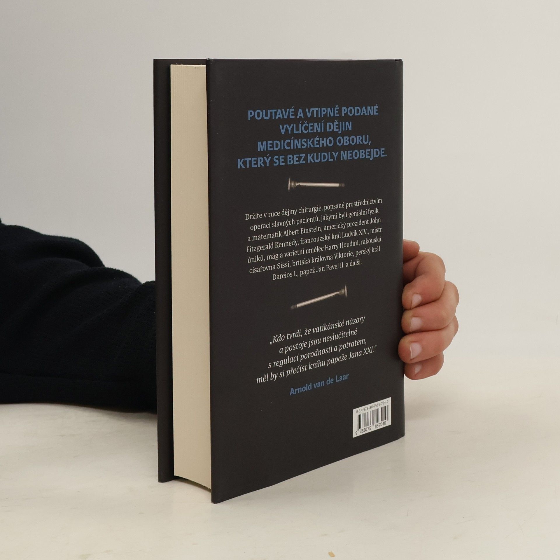 Nizozemský lékař Arnold van de Laar líčí dějiny chirurgie zasvěcenému i laickému čtenáři se smyslem pro detail i anekdotickou zkratku. Zvolil k tomu případy proslulých pacientů, jako byl geniální fyzik a matematik Albert Einstein, americký prezident John Fitzgerald Kennedy, francouzský král Ludvík XIV., mistr úniku, mág a varietní umělec Harry Houdini, rakouská císařovna Sisi, britská královna Viktorie, perský král Dareios, papež Jan Pavel II. a další. Ve 29 kapitolách sledujeme napínavé příběhy, zdárné zákroky i zákroky méně podařené. Od první kapitoly popisující čin chirurga-amatéra, amsterdamského kováře Jana De Doota ve „zlatém“ sedmnáctém století, až po výjimečnou operaci paúhoře elektrického prochází čtenář dobami, kdy „nejdůležitějším atributem v úspěšné praxi… byl rychlý kůň“, vrací se do historie, aby poznal příběh starý 2500 let, žasne nad srovnáním způsobů léčby „tenkrát“ a dnes, připomene si doby, kdy péče o hygienu takřka neexistovala a o anestezii se nikomu ani nesnilo. Poutavé, vtipně podané vylíčení dějin medicínského oboru, který se bez nože neobejde.