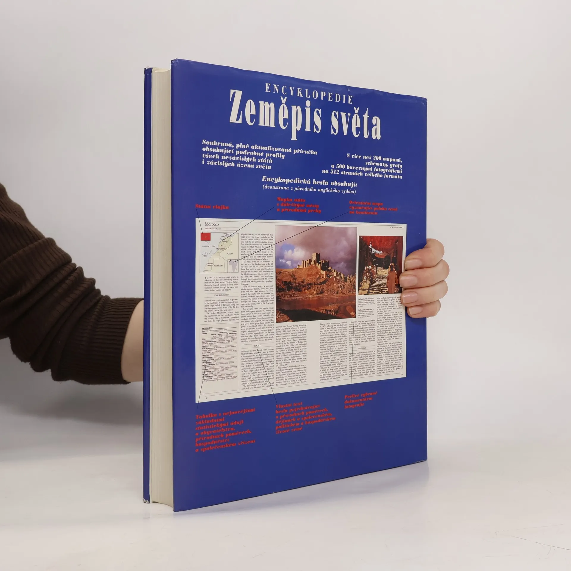 V posledním desetiletí jsme byli svědky posunů hranic a vzniku nových států, ale dosud chyběla souhrnná příručka, která by informovala o těchto změnách. Encyklopedie Zeměpis světa se zaměřuje na všechny země, včetně těch vzniklých po rozpadu SSSR, Jugoslávie a Československa. Obsahuje podrobné profily 189 zemí, které jsou mnohem obsáhlejší než obvyklé encyklopedické svazky, a zahrnuje mapy, fakta, statistiky a fotografie, což ji činí jednou z nejpraktičtějších příruček. Rozsah hesel se liší, od 50 stran pro USA po jednostránkové profily menších zemí, přičemž každé heslo je založeno na aktuálních údajích a strukturováno tak, aby usnadnilo porovnávání. Profily zahrnují tři hlavní oddíly: Přírodní poměry, Společnost a Hospodářství, popisující klimatické podmínky, historické události, kulturu a hospodářství. Země jsou rozděleny podle geografických oblastí, přičemž každá má svou mapu a obsahuje státní vlajku, umístění na kontinentu a základní statistické údaje. Některá hesla obsahují i ilustrované články o unikátních kulturních a historických jevech. V knize jsou uvedena chybná ISBN 80-901727-6-8 a 80-7176-022-6.