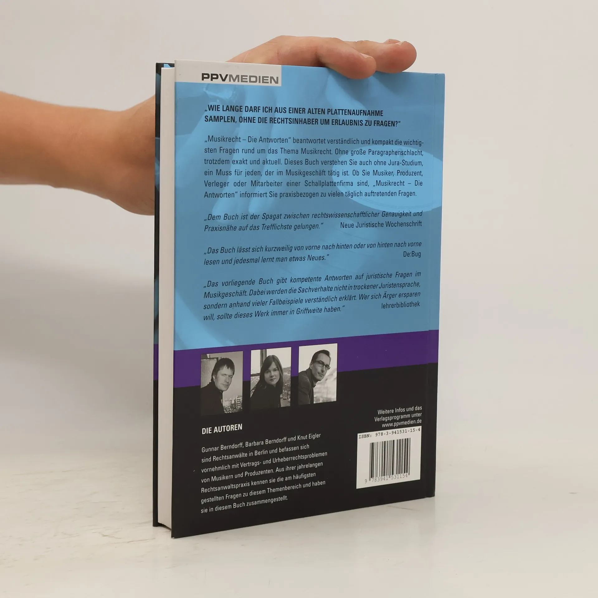 „Wie lange darf ich aus einer alten Plattenaufnahme samplen, ohne die Rechteinhaber um Erlaubnis zu fragen?“ „Musikrecht- die Antworten“ beantwortet verständlich und kompakt die wichtigsten Fragen rund um das Thema Musikrecht. Ohne große Paragraphenschlacht, trotzdem exakt und aktuell. Dieses Buch verstehen Sie auch ohne Jura-Studium, ein Muß für jeden, der im Musikgeschäft tätig ist. Ob Sie Musiker, Produzent, Verleger oder Mitarbeiter einer Schallplattenfirma sind, "Musikrecht - die Antworten informiert Sie praxisbezogen zu vielen täglich auftretenden Fragen.