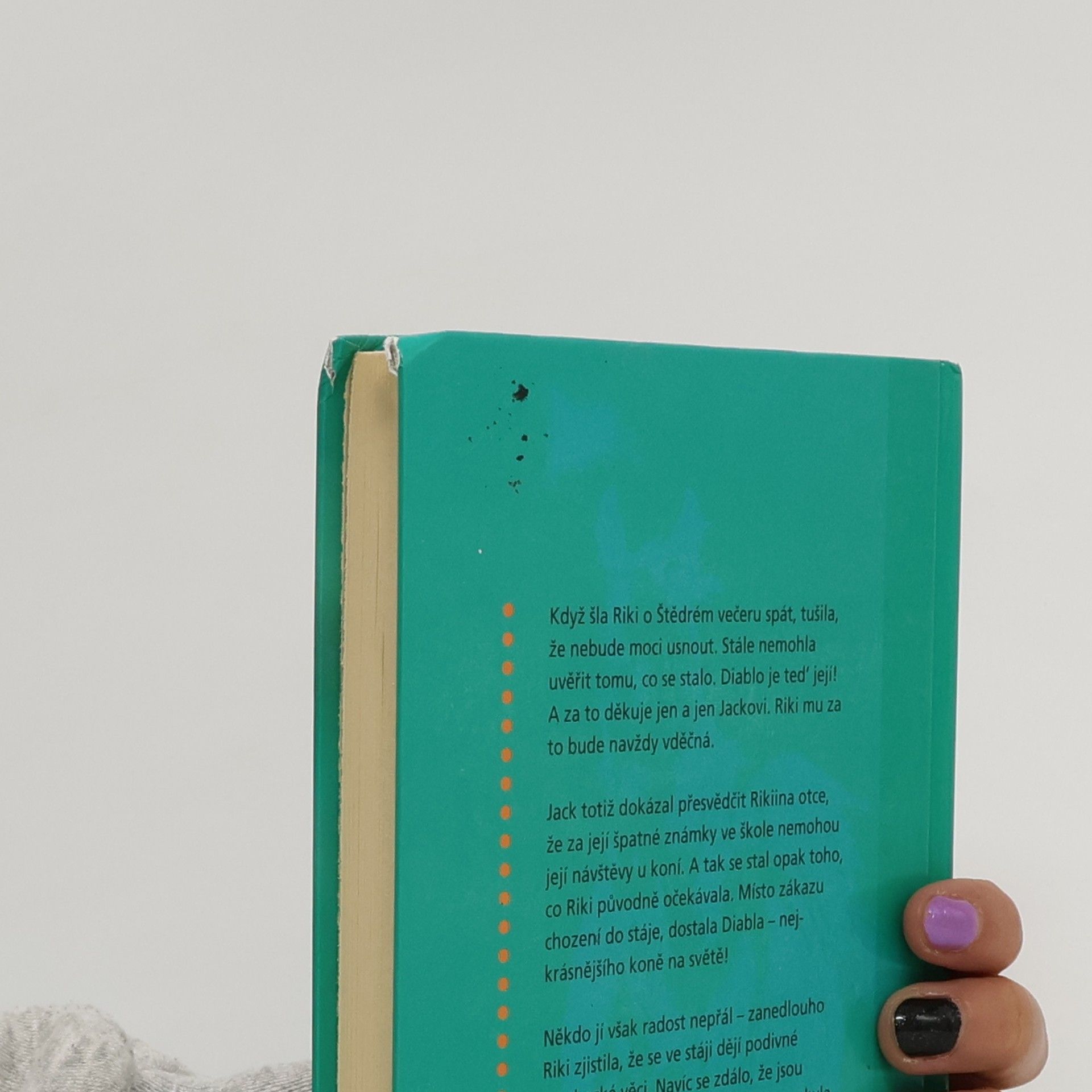 Když šla Riki o Štědrém večeru spát, tušila, že nebude moci usnout. Stále nemohla uvěřit tomu, co se stalo. Diablo je teď její! A za to děkuje jen a jen Jackovi. Riki mu za to bude navždy vděčná. Jack totiž dokázal přesvědčit Rikiina otce, že za její špatné známky ve škole nemohou její návštěvy u koní. A tak se stal opak toho, co Riki původně očekávala. Místo zákazu chození do stáje, dostala Diabla – nejkrásnějšího koně na světě! Někdo jí však radost nepřál – zanedlouho Riki zjistila, že se ve stáji dějí podivné a nehezké věci. Navíc se zdálo, že jsou namířeny proti Diablovi! Riki vůbec nebyla připravená na to, že její štěstí vyvolá u jiných lidí závist. A závist se může snadno změnit v nenávist…