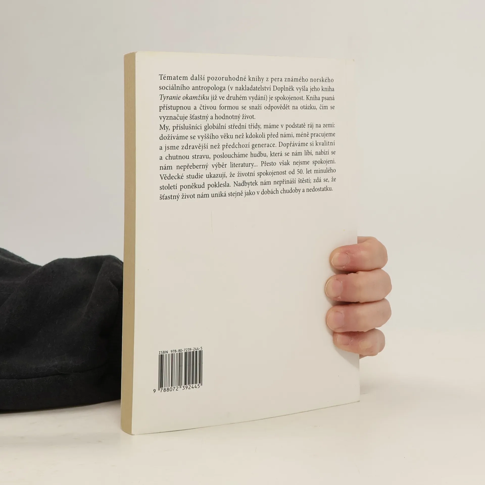 Tématem další pozoruhodné knihy z pera známého norského sociálního antropologa (v Doplňku již vyšla jeho kniha Tyranie okamžiku) je spokojenost. Kniha psaná přístupnou a čtivou formou se snaží odpovědět na otázku, čím se vyznačuje šťastný a hodnotný život. My, příslušníci globální střední třídy, máme v podstatě ráj na zemi: dožíváme se vyššího věku než kdokoli před námi, méně pracujeme a jsme zdravější než předchozí generace. Dopřáváme si kvalitní a chutnou stravu, posloucháme hudbu, která se nám líbí, nabízí se nám nepřeberný výběr literatury… Přesto však nejsme spokojeni. Vědecké studie ukazují, že životní spokojenost od 50. let minulého století poněkud poklesla. Nadbytek nám nepřináší štěstí. Zdá se, že šťastný život nám uniká stejně jako v dobách chudoby a nedostatku.