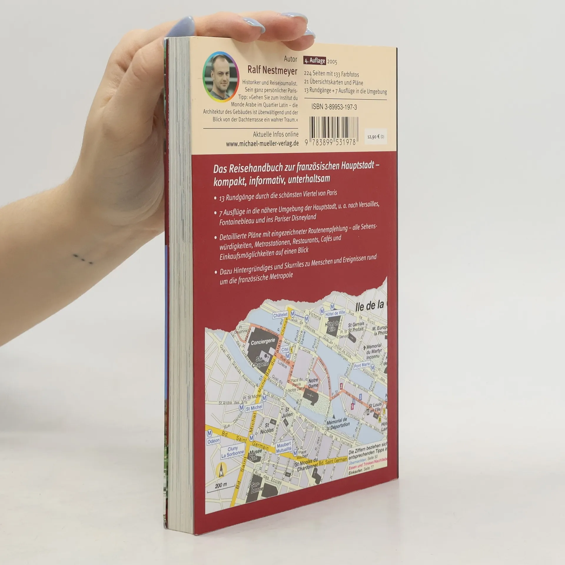 Der ehemals erste reine Städtereiseführer des Michael Müller Verlags führt den Leser nach Paris, in die Stadt der Flaneure, der Kunstliebhaber, Nachtschwärmer, Liebespaare und Gourmets. In 13 ausgewählten Spaziergängen präsentiert das Buch neben dem klassischen Sightseeing-Programm mit Eiffelturm, Louvre, Montmartre und Versailles auch die modernen Seiten der französischen Metropole, etwa das gigantische Büro- und Geschäftsviertel La Défense mit der Grande Arche, dem modernen Triumphbogen, oder den futuristischen Parc de la Vilette mit seinem Wahrzeichen, dem Kugelkino La Géode. Am Schluss jedes Kapitels findet man einen umfangreichen Katalog praktischer Informationen, angefangen von Shoppingtipps bis hin zu Informationen über Restaurants, Szenekneipen und Cafés. Vervollständigt wird der Guide durch detailliertes Kartenmaterial, das die Orientierung in der pulsierenden Millionenstadt erleichtert. Dazu Übernachtungstipps, Veranstaltungskalender und jede Menge weiterer Informationen, die bei einem Paris-Aufenthalt nützlich sind.