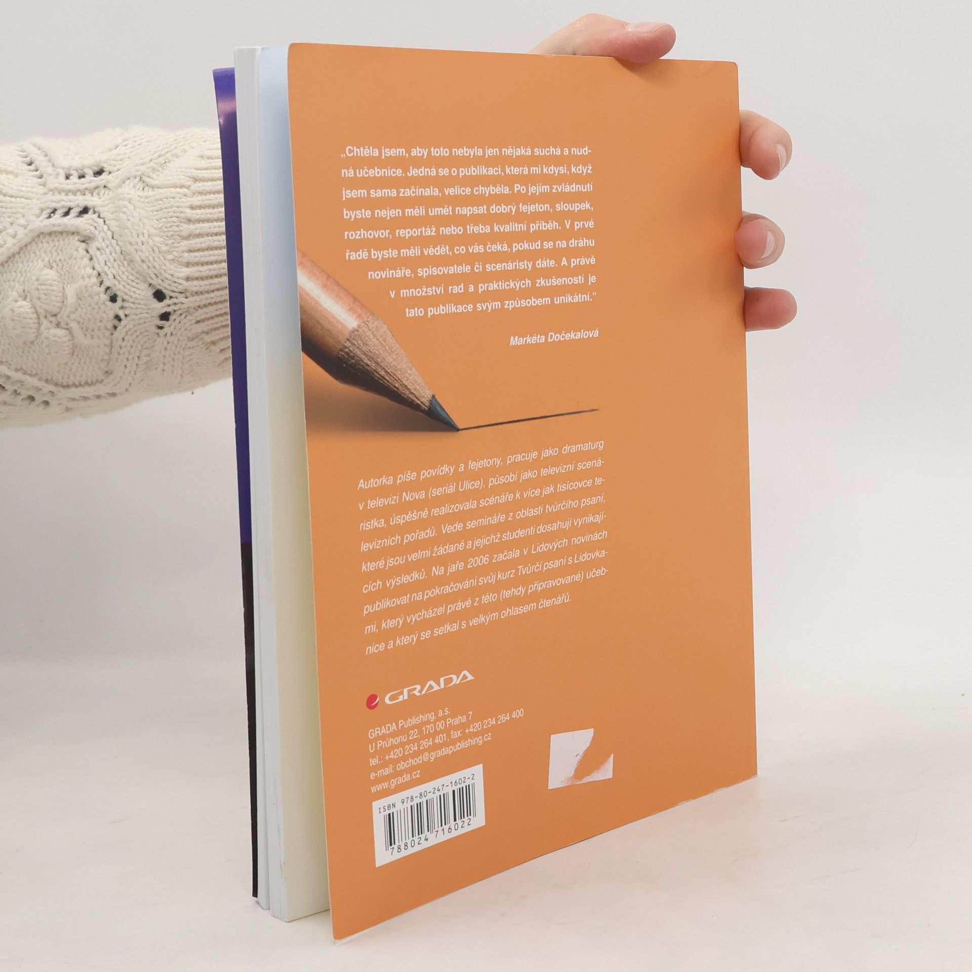 Čtenář se naučí psát a pracovat se svým tvůrčím potenciálem, pozná základní novinářské žánry i principy tvorby příběhů, stavby postav, zvládnutí dialogů a další aspekty tvůrčího psaní. Jde o ryze praktickou a moderní učebnici tvůrčího psaní, která je obohacena o celou řadu praktických cvičení umožňujích čtenářům ověření získaných znalostí a dovedností. Autorka vede semináře z oblasti tvůrčího psaní, které jsou velmi žádané a jejichž studenti dosahují vynikajících výsledků. Na jaře 2006 začala v Lidových novinách publikovat na pokračování svůj kurz Tvůrčí psaní s Lidovkami, který vycházel právě z této (tehdy připravované) učebnice a který se setkal s velkým ohlasem čtenářů. Kromě psaní povídek a fejetonů, pracuje jako dramaturg v televizi Nova (seriál Ulice), působí jako televizní scenáristka, úspěšně realizovala scénáře k více jak tisícovce televizních pořadů.... celý text