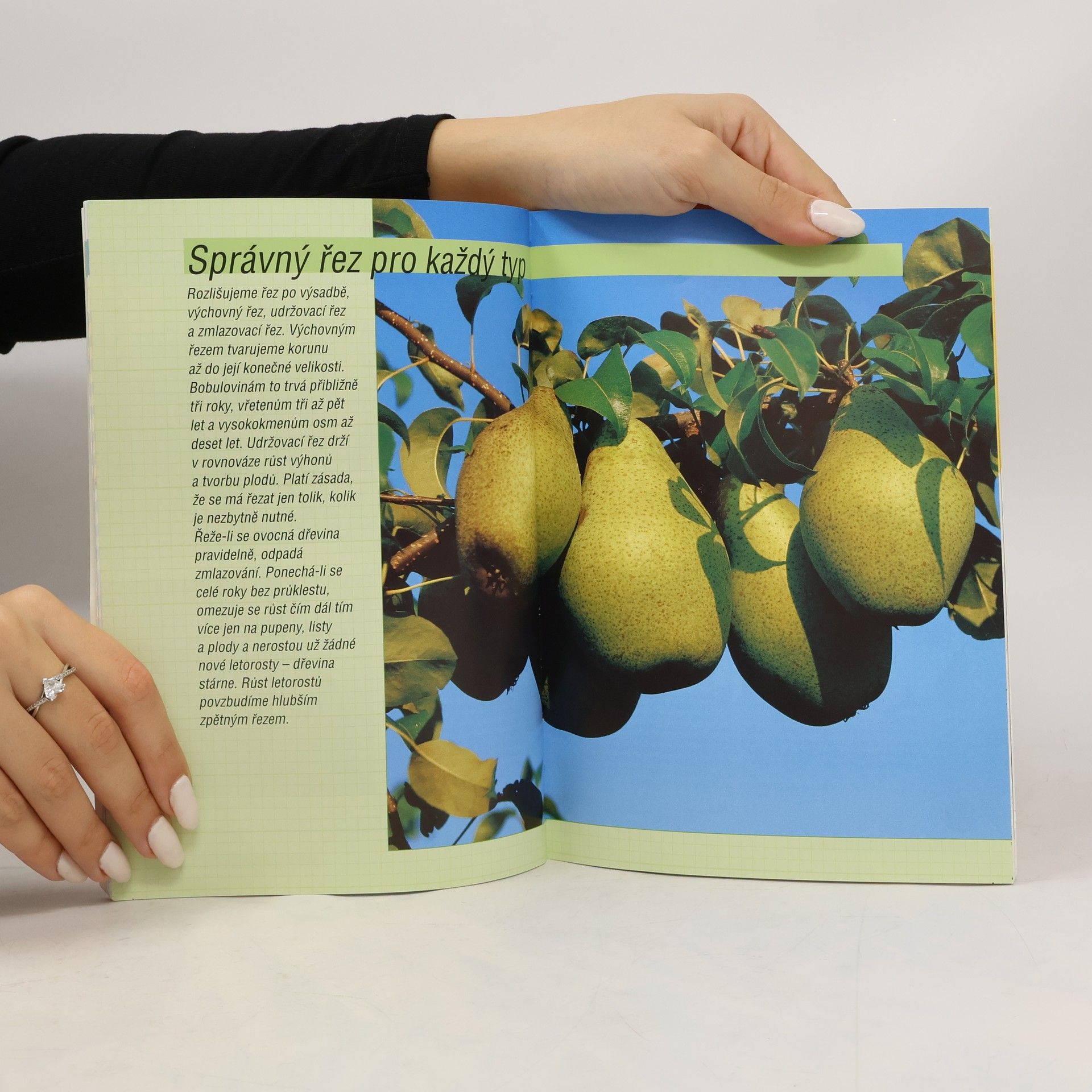Praktická příručka názorně popisuje řez ovocných stromů a keřů. Po všeobecných zásadách a pravidlech řezu a výběru potřebného pracovního nářadí se věnuje podrobnému a názornému řezu a postupnému tvarování ovocných stromů a keřů (vysoký kmen, talířovitá koruna, zmlazování atd.) Samostatné kapitoly jsou věnovány výsadbě a řezu borůvek, maliníku, ostružiníku, aktinidii (čnělkovec, kiwi) a révě vinné. Upozorňuje na časté chyby. Všechny postupy jsou předvedeny na názorných kresbách.