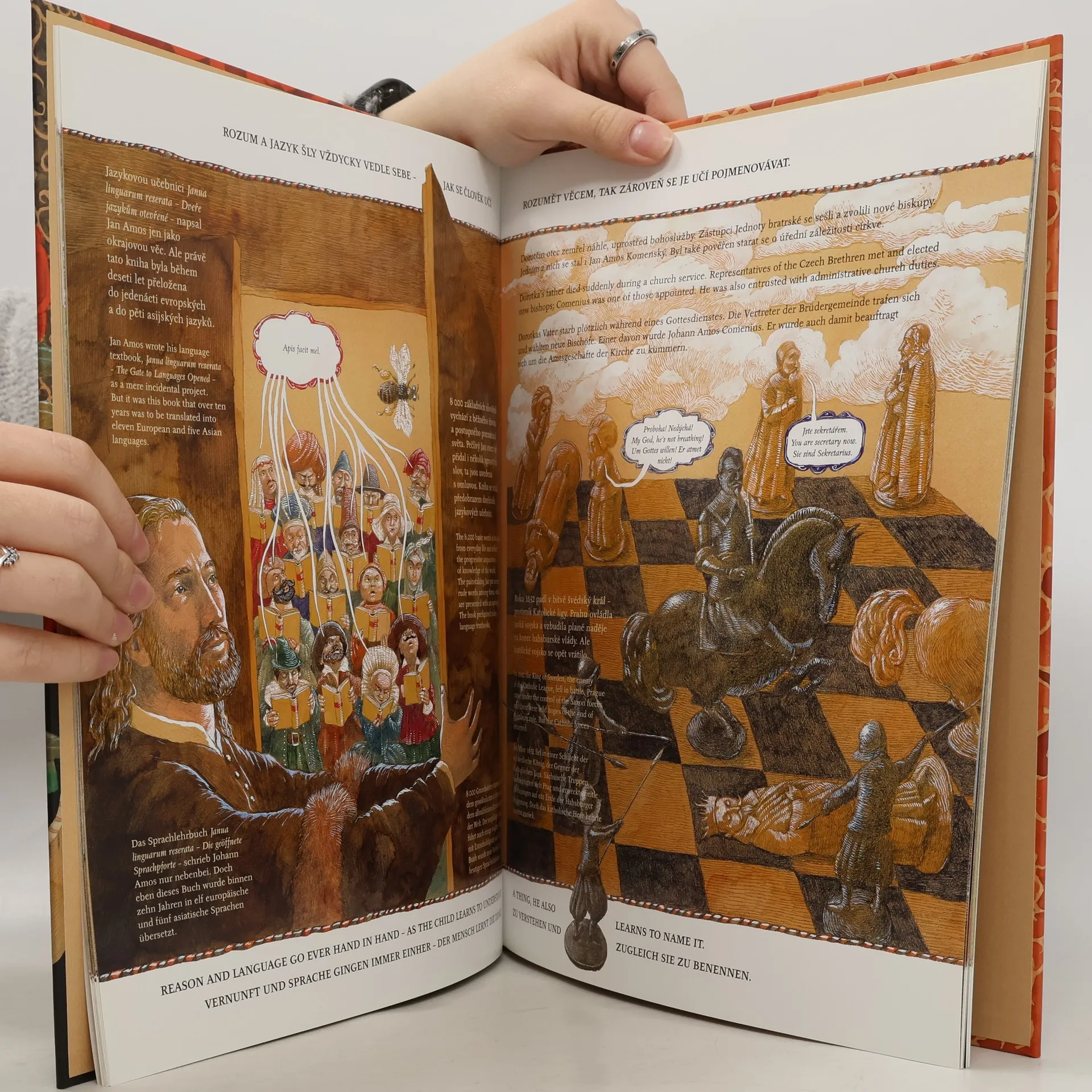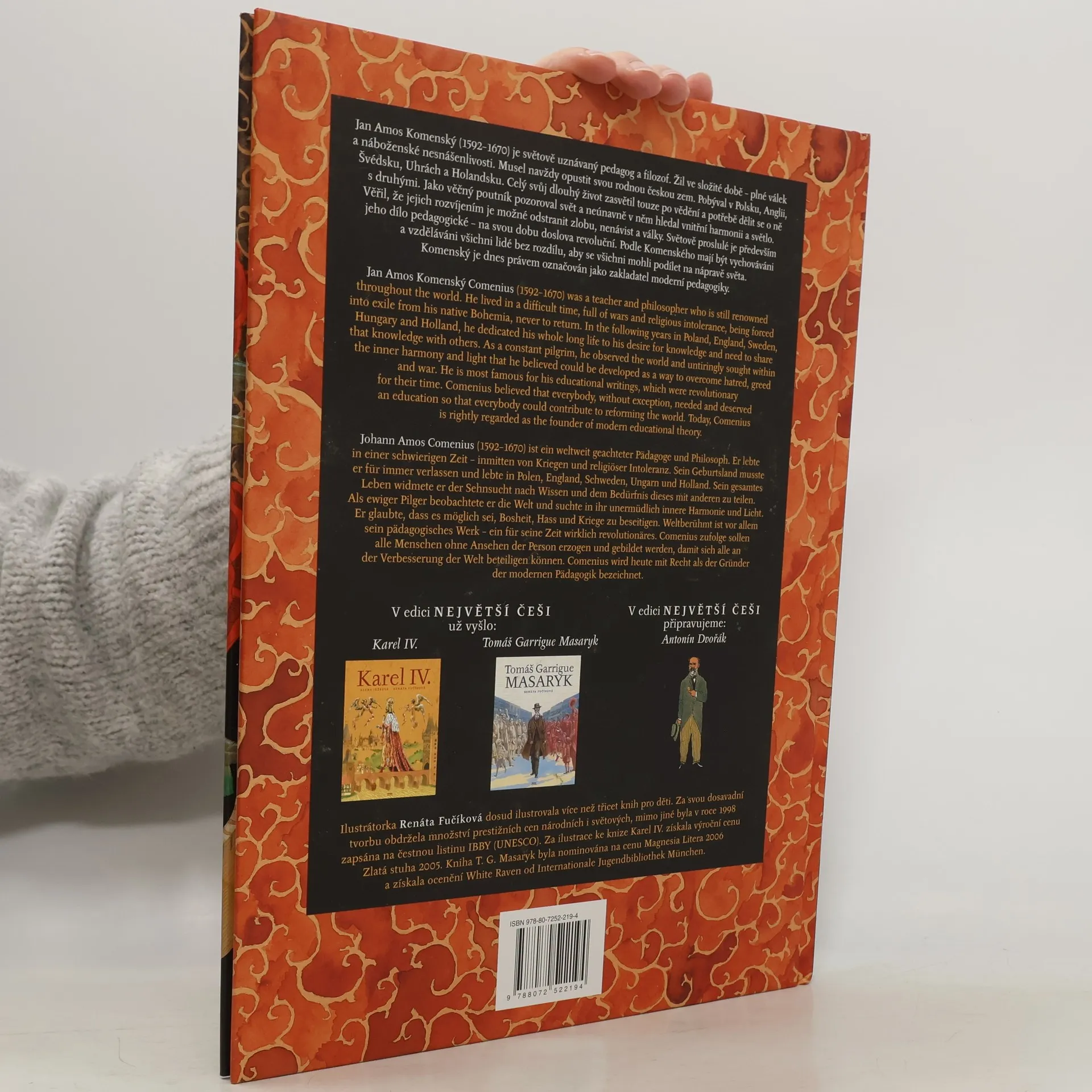Kniha velkého formátu a velkolepých ilustrací včetně dobových map představuje největšího ducha, jakého Čechy daly Evropě a světu - jeho život i dílo, to všechno velmi přístupnou a srozumitelnou formou. Třetí titul edice Největší Češi představuje Jana Amose Komenského jako našeho největšího filozofa, učence, který zasvětil celý svůj život šíření vědění a ideálů. Postupně jsou představeny jednotlivé osobnosti tehdejší Evropy, které při svém dramatickém putování potkal. Jedná se o knihu, která emotivně představuje radosti i utrpení Komenského, jeho touhy a ustavičné hledání nejvyššího dobra. Významný prvek představuje i předložení jakési dobové fresky, pozadí událostí Komenského života, vyobrazení konfliktů třicetileté války v kontrastu s utopistickými mírovými představami našeho největšího filozofa - tak cenné a zajímavé v dnešní době společného soužití a spolupráce celé Evropy. Děj samotný je vyprávěn česky a souběžně anglicky a německy. Tím naprosto přirozeně připomíná jedno ze stěžejních děl Komenského - Brána jazyků otevřená. Čtenáři tak mohou knihu využít i k zajímavému srovnání všech jazykových verzí a zároveň i k rozšíření slovní zásoby. Kniha zároveň nalezne uplatnění i jako reprezentativní dárek do zahraničí. Vždyť čím lepším se můžeme v rámci evropské civilizace pochlubit, než naším nejvýznamnějším myslitelem, který ve své době posouval dopředu tehdejší poznání světa.