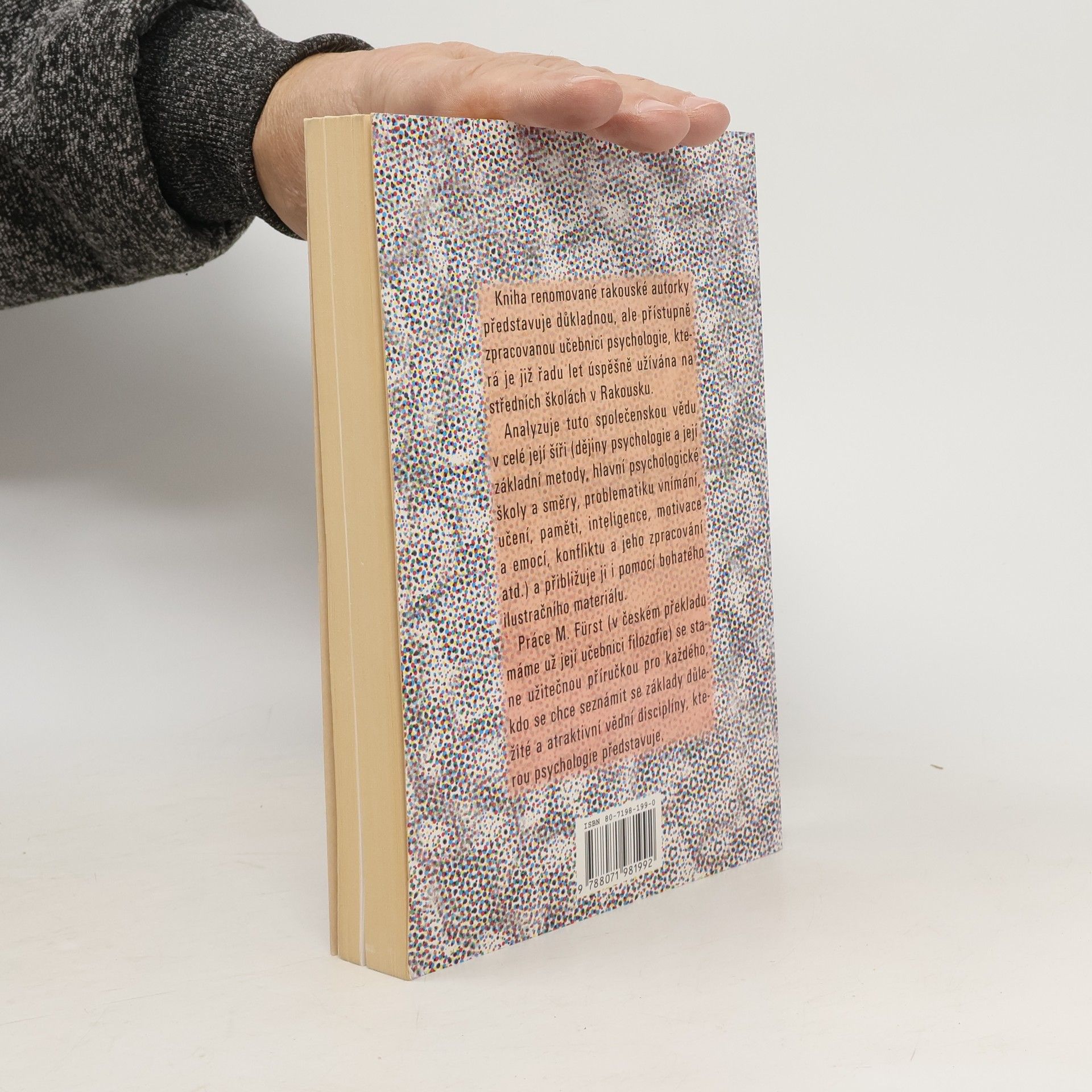 Podtitul: "Včetně vývojové psychologie a teorie výchovy" Kniha renomované rakouské autorky představuje důkladnou, ale přístupně zpracovanou učebnici psychologie, která je již řadu let úspěšně užívána na středních školách v Rakousku. Analyzuje tuto společenskou vědu v celé její šíři (dějiny psychologie a její základní metody a směry, problematiku vnímání, učení, paměti, inteligence, motivace a emocí, konfliktu a jeho zpracování atd.) a přibližuje ji i pomocí bohatého ilustračního materiálu. Práce M. Fürst (v českém překladu máme už její učebnici filozofie) se stane užitečnou příručkou pro každého, kdo se chce seznámit se základy důležité a atraktivní vědní disciplíny, kterou psychologie představuje.