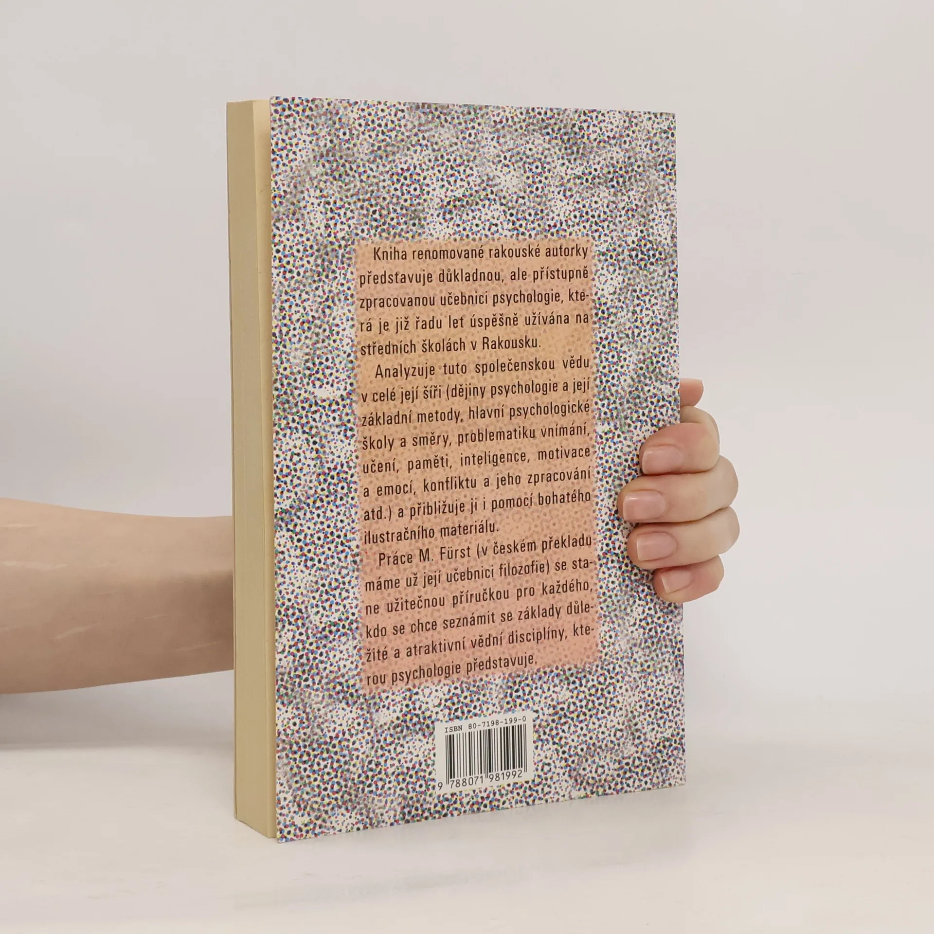 Podtitul: "Včetně vývojové psychologie a teorie výchovy" Kniha renomované rakouské autorky představuje důkladnou, ale přístupně zpracovanou učebnici psychologie, která je již řadu let úspěšně užívána na středních školách v Rakousku. Analyzuje tuto společenskou vědu v celé její šíři (dějiny psychologie a její základní metody a směry, problematiku vnímání, učení, paměti, inteligence, motivace a emocí, konfliktu a jeho zpracování atd.) a přibližuje ji i pomocí bohatého ilustračního materiálu. Práce M. Fürst (v českém překladu máme už její učebnici filozofie) se stane užitečnou příručkou pro každého, kdo se chce seznámit se základy důležité a atraktivní vědní disciplíny, kterou psychologie představuje.
