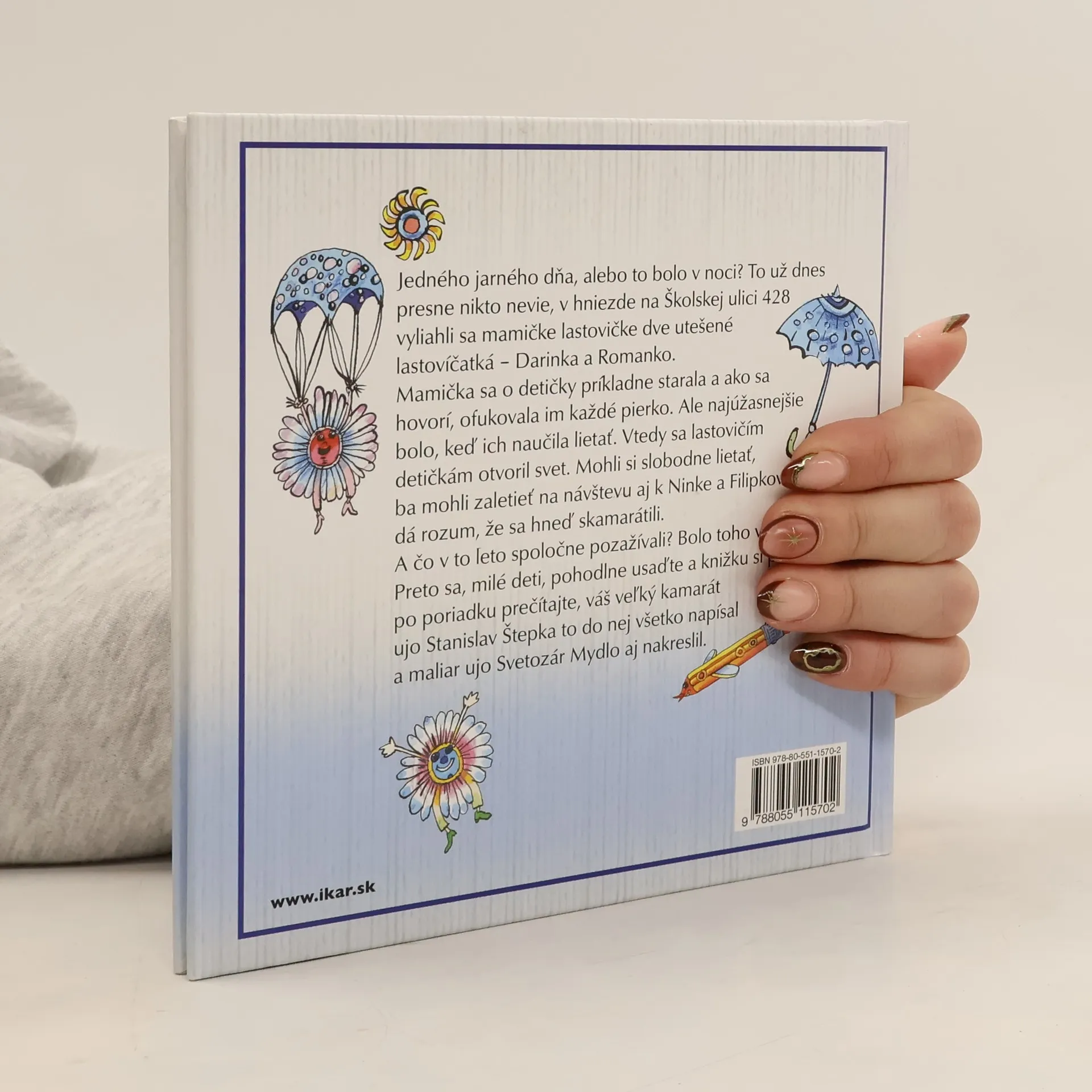 Rozprávky, ktoré Stanislav Štepka rozprával najskôr svojim vnúčatám a potom ich zapísal. Zakladateľ, režisér a herec Radošinského naivného divadla ich v júni chystá aj na javisko. Rozprávka o dvoch utešených lastovíčatkách - Darinke a Romankovi - sa začína v hniezde na Školskej ulici 428. Keď ich mamka naučila lietať, lastovičím detičkám sa otvoril svet, v ktorom ich čakali kamaráti aj dobrodružstvá. Knihu majstra rozprávača ilustroval autor radošinskej muchotrávky a ďalších veselých obrázkov - Svetozár Mydlo.