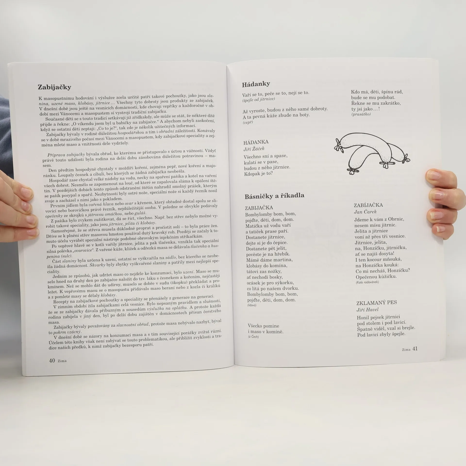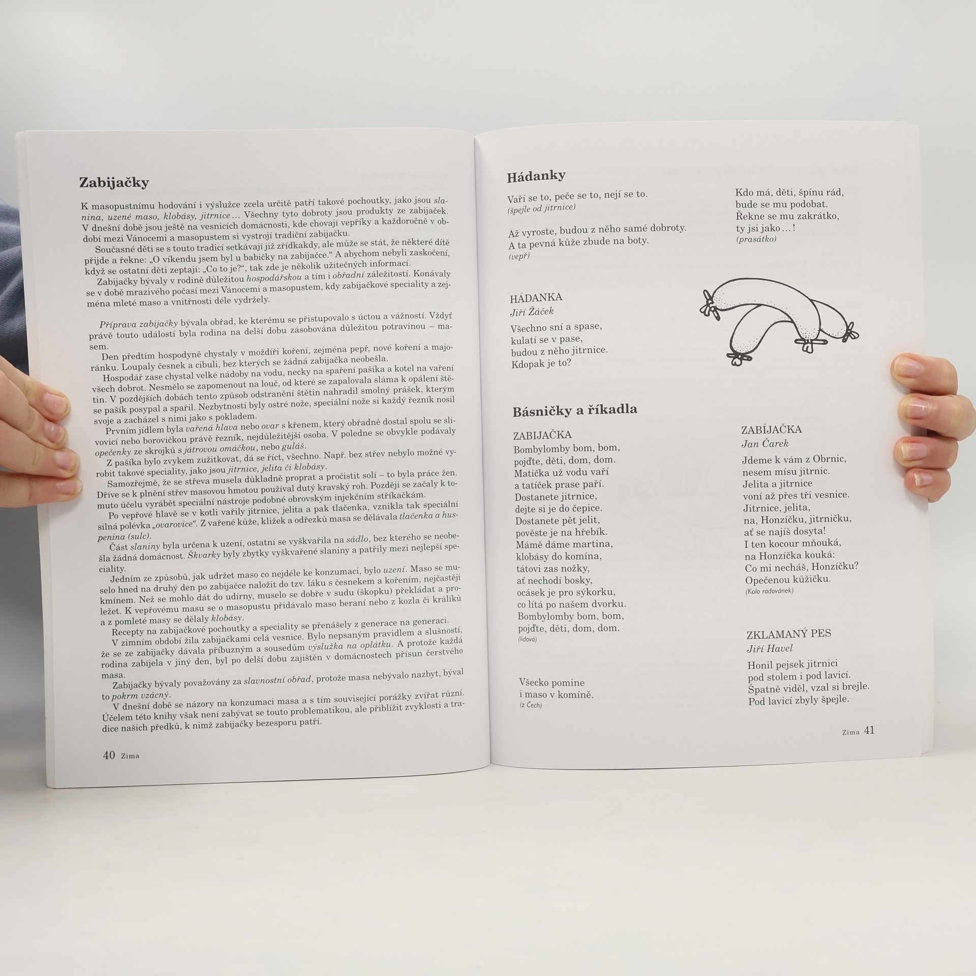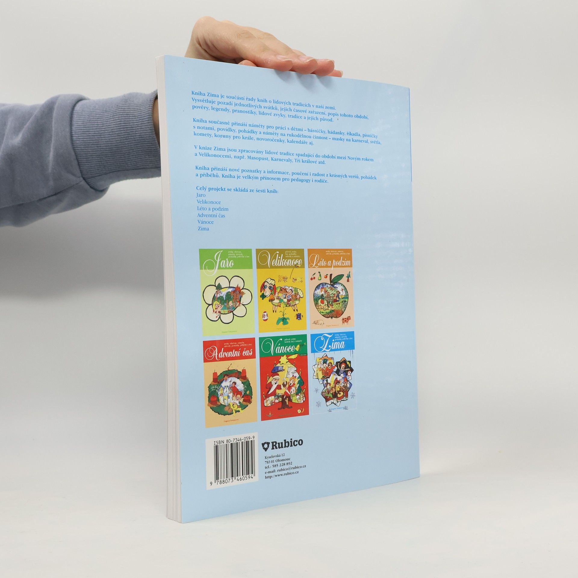 Kniha Zima je součástí řady knih o lidových tradicích v naší zemi. Vysvětluje pozadí jednotlivých svátků, jejich časové zařazení, popis tohoto období, pověry, legendy, pranostiky, lidové zvyky, tradice a jejich původ. Kniha současně přináší náměty pro práci s dětmi - básničky, hádanky, říkadla, písničky s notami, povídky, pohádky a náměty na rukodělnou činnost - masky na karneval, světla, komety, koruny pro krále, novoročenky, kalendáře, aj. V knize Zima jsou zpracovány lidové tradice spadající do období mezi Novým rokem a Velikonocemi, např. Masopust, Karnevaly, Tři králové, atd. Kniha přináší nové poznatky a informace, poučení i radost z krásných veršů, pohádek a příběhů. Kniha je velkým přínosem pro pedagogy i rodiče.