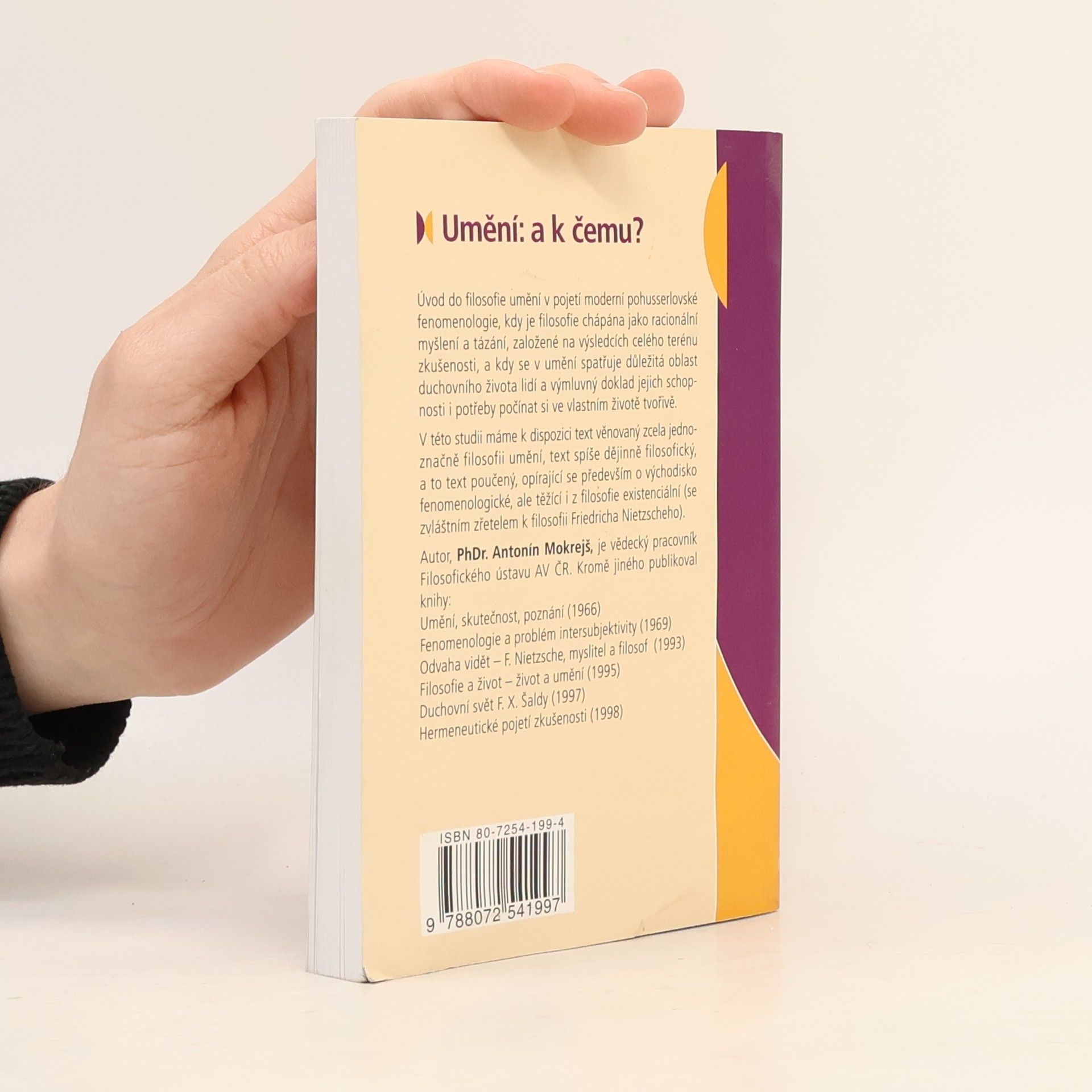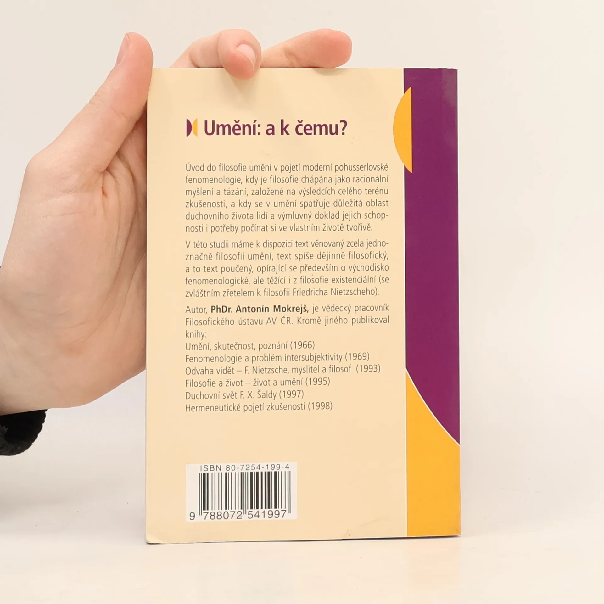 Úvod do filosofie umění v pojetí moderní pohusserlovské fenomenologie, kdy je filosofie chápána jako racionální myšlení a tázání, založené na výsledcích celého terénu zkušenosti, a kdy se v umění spatřuje důležitá oblast duchovního života lidí a výmluvný doklad jejich schopnosti i potřeby počínat si ve vlastním životě tvořivě. V této studii máme k dispozici text věnovaný zcela jednoznačně filosofii umění, text spíše dějinně filosofický, a to text poučený, opírající se především o východisko fenomenologické, ale těžící i z filosofie existenciální (se zvláštním zřetelem k filosofii Friedricha Nietzscheho). Autor, PhDr. Antonín Mokrejš, je vědecký pracovník Filosofického ústavu AV ČR.