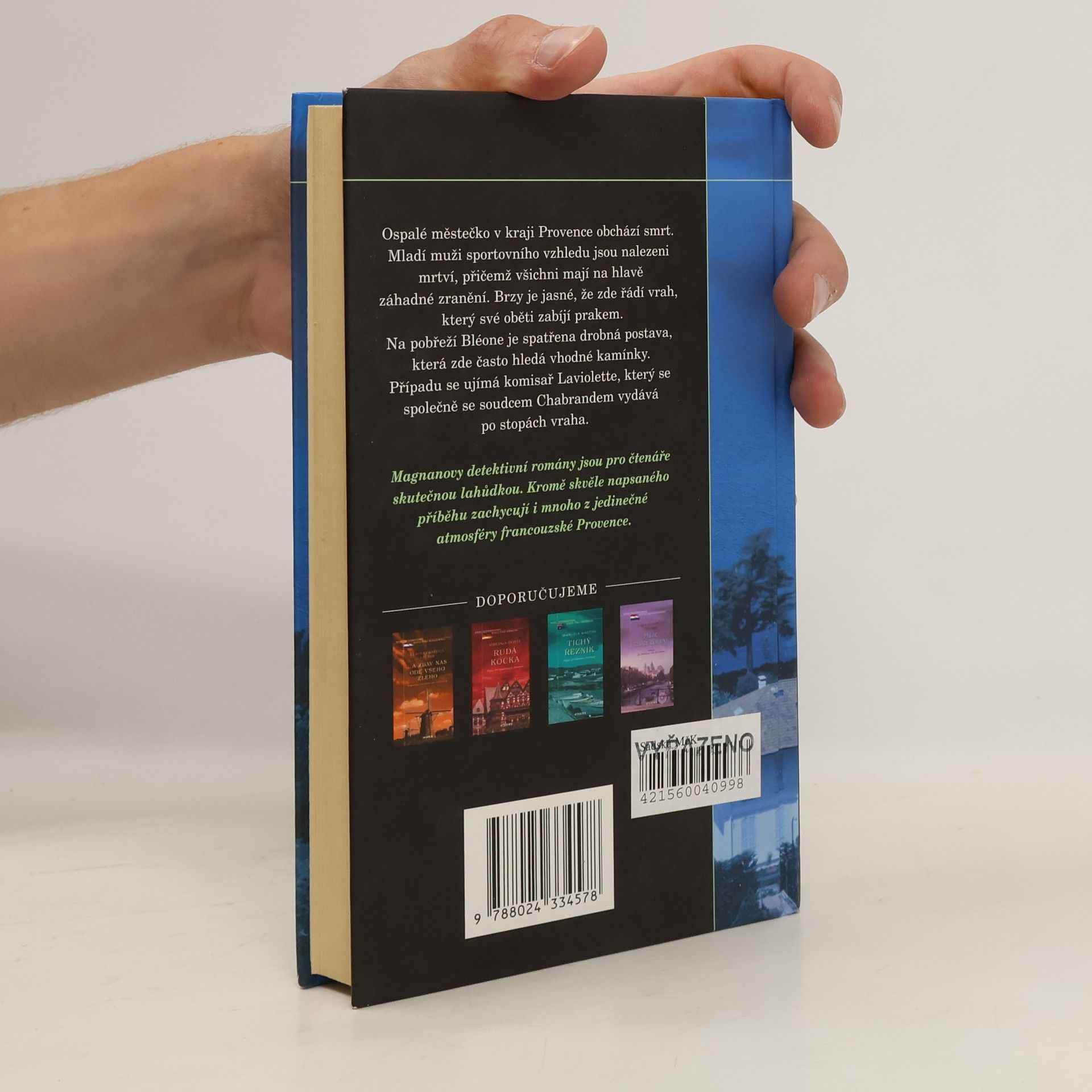 Ospalé městečko v kraji Provence obchází smrt. Mladí muži sportovního vzhledu jsou nalezeni mrtví, přičemž všichni mají na hlavě záhadné zranění. Brzy je jasné, že zde řádí vrah, který své oběti zabíjí prakem. Na břehu řeky Bléone je spatřena drobná postava, která zde často hledá vhodné kamínky. Případu se ujímá komisař Laviolette, který se společně se soudcem Chabrandem vydává po stopách záhadného vraha. Magnanovy detektivní romány jsou pro čtenáře skutečnou lahůdkou. Kromě skvěle napsaného příběhu zachycují i mnoho z jedinečné atmosféry francouzské Provence.