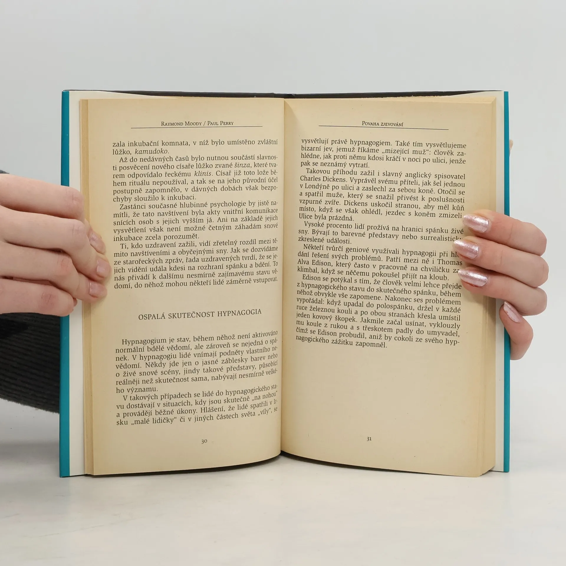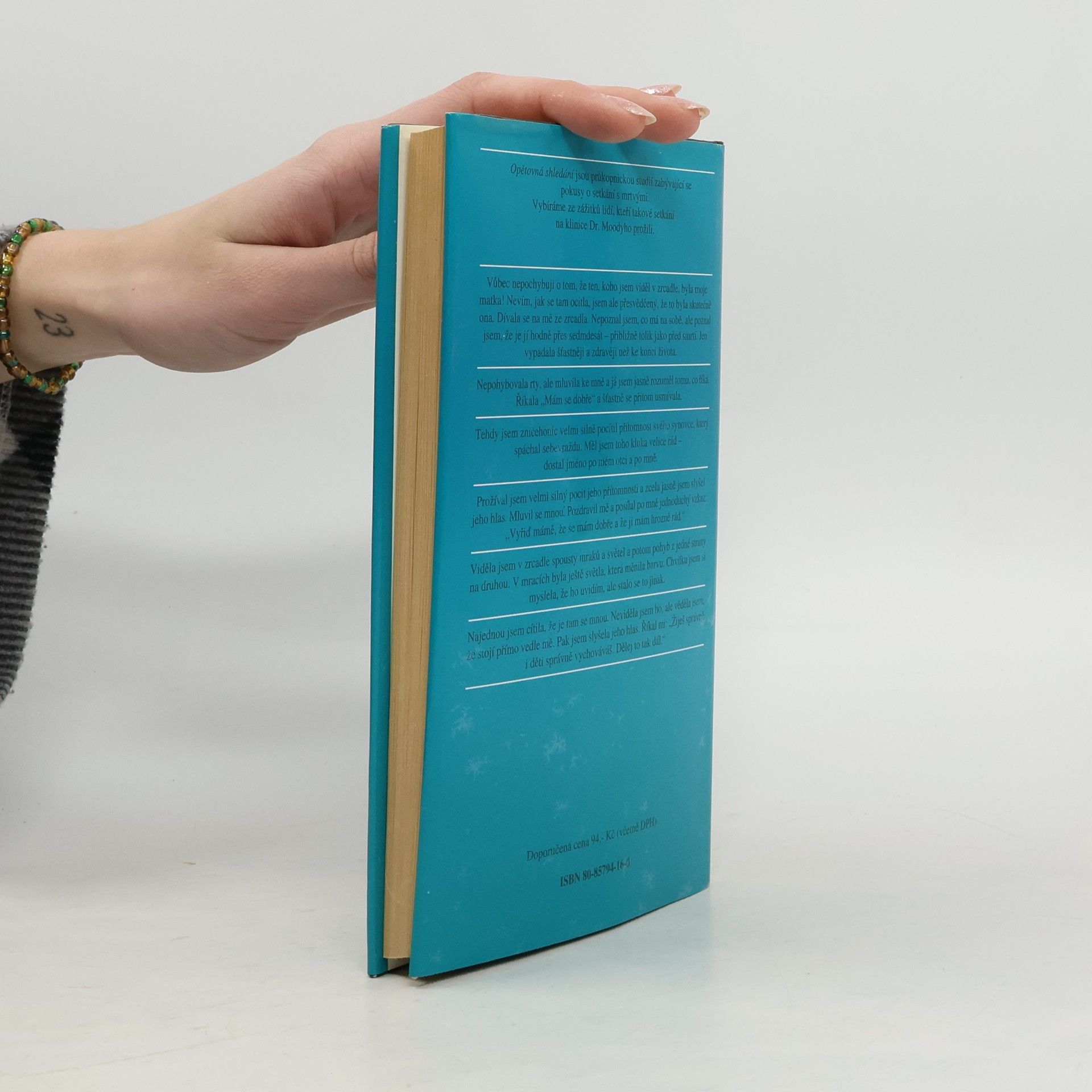 Opětovná shledání jsou průkopnickou studií zabývající se pokusy o setkání s mrtvými. Vybíráme ze zážitků lidí, kteří takové setkání na klinice Dr. Moodyho prožili. Vůbec nepochybuji o tom, že ten, koho jsem viděl v zrcadle, byla moje matka! Nevím, jak se tam ocitla, jsem ale přesvědčený, že to byla skutečně ona. Dívala se na mě ze zrcadla. Nepoznal jsem, co má na sobě, ale poznal jsem, že je jí hodně přes sedmdesát — přibližně tolik jako před smrtí. Jen vypadala šťastněji a zdravěji než ke konci života. Nepohybovala rty, ale mluvila ke mně a já jsem jasně rozuměl tomu, co říká. Říkala „Mám se dobře“ a šťastně se přitom usmívala. Tehdy jsem zničehonic velmi silně pocítil přítomnost svého synovce, který spáchal sebevraždu. Měl jsem toho kluka velice rád — dostal jméno po mém otci a po mně. Prožíval jsem velmi silný pocit jeho přítomnosti a zcela jasně jsem slyšel jeho hlas. Mluvil se mnou. Pozdravil mě a posílal po mně jednoduchý vzkaz: „Vyřiď mámě, že se mám dobře a že ji mám hrozně rád.“ Viděla jsem v zrcadle spousty mraků a světel a potom pohyb z jedné strany na druhou. V mracích byla ještě světla, která měnila barvu. Chvilku jsem si myslela, že ho uvidím, ale stalo se to jinak. Najednou jsem cítila, že je tam se mnou. Neviděla jsem ho, ale věděla jsem, že stojí přímo vedle mě. Pak jsem slyšela jeho hlas. Říkal mi: „Žiješ správně i děti správně vychováváš. Dělej to tak dál.“ Vydání první