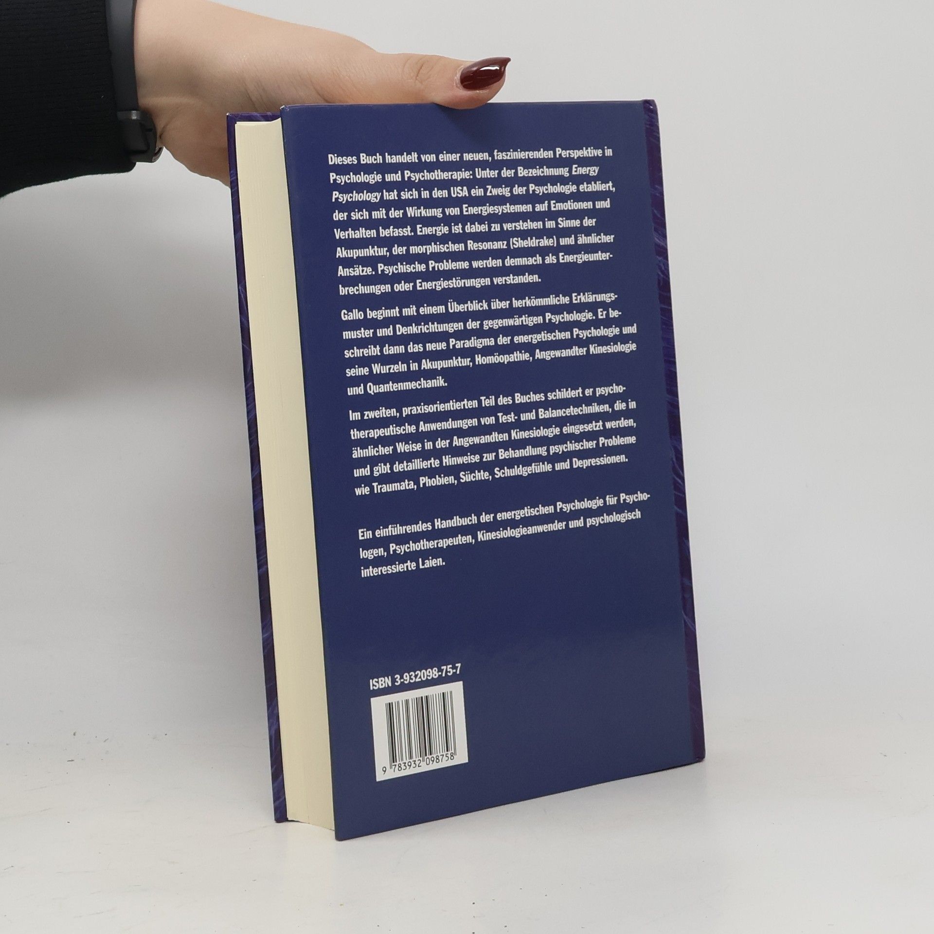 In diesem Buch stellt Fred Gallo einen neuen Zweig der Psychologie vor, der sich mit der Wirkung von Energiesystemen auf Emotionen und Verhalten befasst: die energetische Psychologie. Sie hat ihre Wurzeln in Akupunktur, Homöopathie, Angewandter Kinesiologie und Quantenmechanik. Gallo beschreibt die psychotherapeutische Anwendung von Test- und Balancetechniken und gibt detaillierte Hinweise zur Klopfakupressur bei psychischen Problemen wie Traumata oder Depressionen. Ein einführendes Handbuch für Psychologen und Therapeuten.
