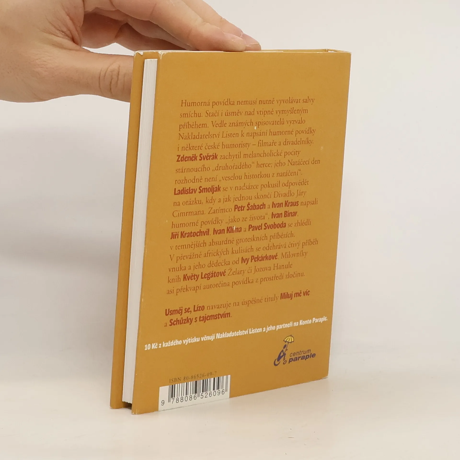 Humorná povídka nemusí nutně vyvolat salvy smíchu. Stačí i úsměv nad vtipně vymyšleným příběhem. Vedle známých spisovatelů vyzvalo nakladatelství Listen k napsání humorné povídky i některé české humoristy - filmaře a divadelníky. Zdeněk Svěrák zachytil melancholické pocity stárnoucího "druhořadého" herce; jeho Natáčecí den rozhodně není "veselou příhodou z natáčení". Ladislav Smoljak se v nadsázce pokusil odpovědět na otázku, kdy a jak jednou skončí Divadlo Járy Cimrmana. Zatímco Petr Šabach a Ivan Kraus napsali humorné povídky "jako ze života", Ivan Binar, Jiří Kratochvíl, Ivan Klíma a Pavel Svoboda se zhlédli v temnějších absurdně groteskních příbězích. V převážně afrických kulisách se odehrává čtivý příběh vnuka a jeho dědečka od Ivy Pekárkové. Milovníky knih Květy Legátové asi překvapí autorčina povídka z prostředí zločinu. Usměj se, Lízo navazuje na knihy Miluj mě víc a Schůzky s tajemstvím.... celý text