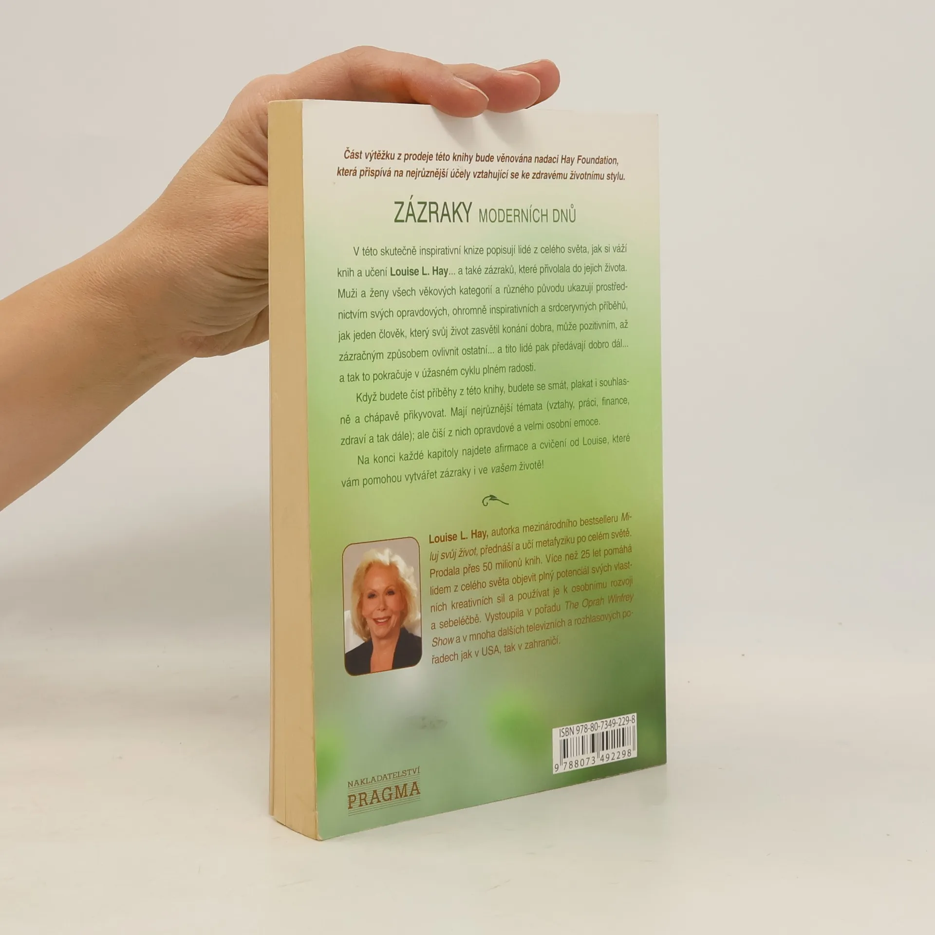 V této skutečně inspirativní knize popisují lidé z celého světa, jak si váží knih a učení Louise L. Hay... a také zázraků, které přivolala do jejich života. Muži a ženy všech věkových kategorií a různého původu ukazují prostřednictvím svých opravdových, ohromně inspirativních a srdceryvných příběhů, jak jeden člověk, který svůj život zasvětil konání dobra, může pozitivním, až zázračným způsobem ovlivnit ostatní... a tito lidé pak předávají dobro dál... a tak to pokračuje v úžasném cyklu plném radosti. Když budete číst příběhy z této knihy, budete se smát, plakat i souhlasně a chápavě přikyvovat. Mají nejrůznější témata (vztahy, práci, finance, zdraví a tak dále); ale čiší z nich opravdové a velmi osobní emoce. Na konci každé kapitoly najdete afirmace a cvičení od Louise, které vám pomohou vytvářet zázraky i ve vašem životě!