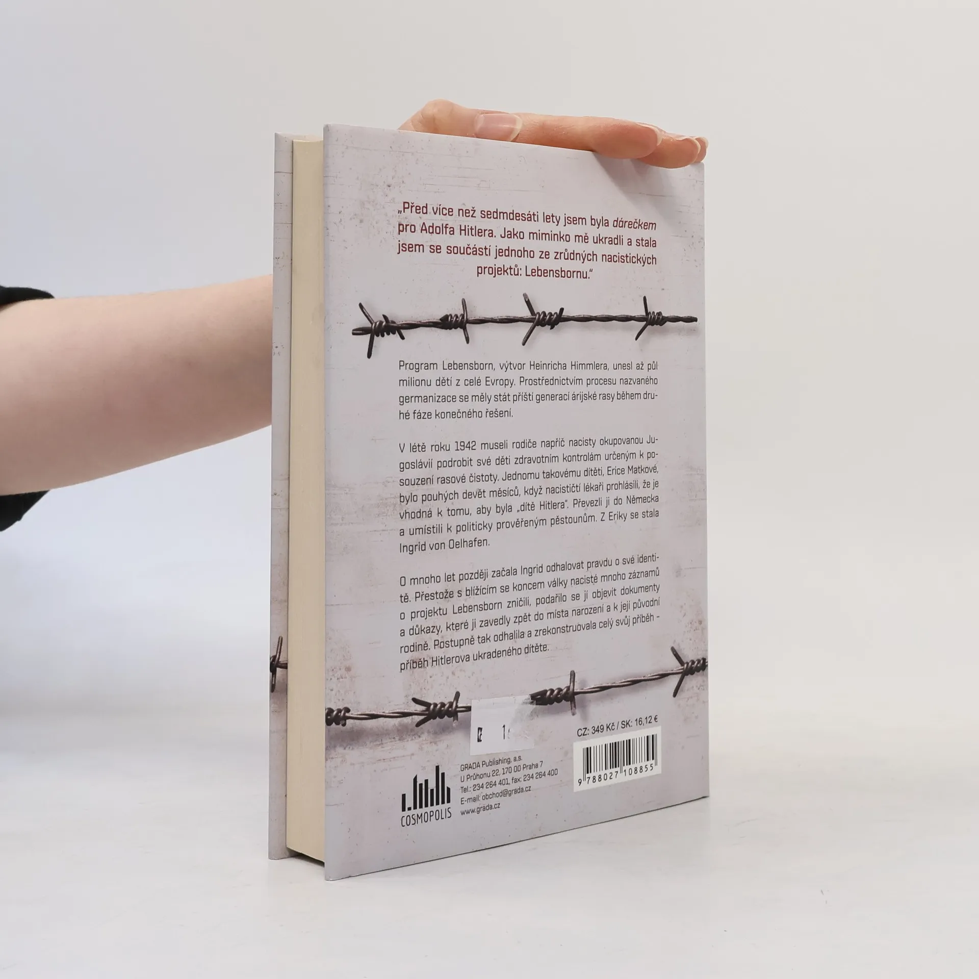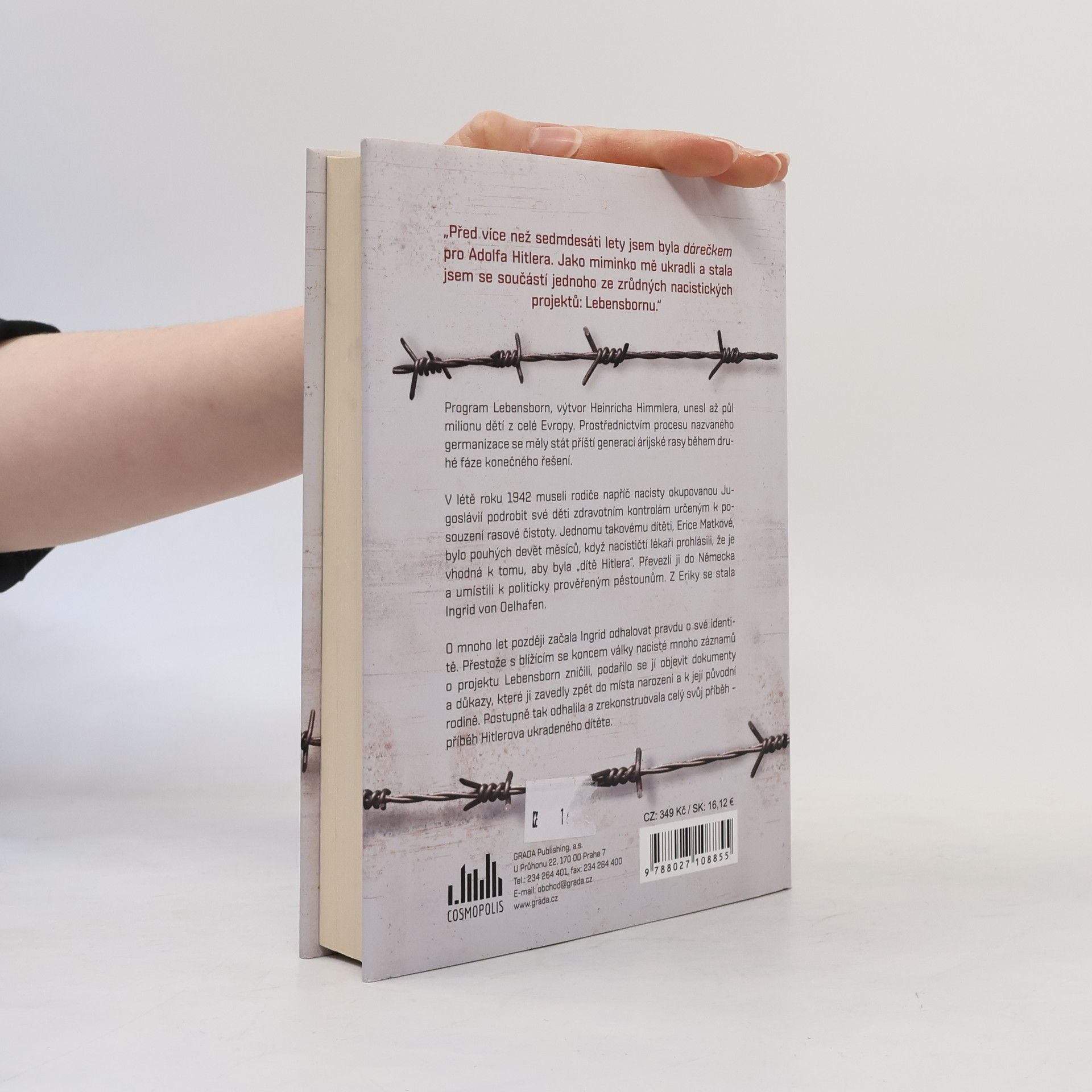 „Před více než 70 lety jsem byla dárečkem pro Adolfa Hitlera. Jako miminko mě ukradli a stala jsem se součástí jednoho ze zrůdných nacistických projektů: Lebensbornu.“ Program Lebensborn, výtvor Heinricha Himmlera, unesl až půl milionu dětí z celé Evropy. Prostřednictvím procesu nazvaného germanizace se měly stát příští generací árijské rasy během druhé fáze konečného řešení. V létě roku 1942 museli rodiče napříč nacisty okupovanou Jugoslávií podrobit své děti zdravotním kontrolám určeným k posouzení rasové čistoty. Jednomu takovému dítěti, Erice Matkové, bylo pouhých 9 měsíců, když nacističtí lékaři prohlásili, že je vhodná k tomu, aby byla „dítě Hitlera“. Převezli ji do Německa a umístili k politicky prověřeným pěstounům. Z Eriky se stala Ingrid von Oelhafen. O mnoho let později začala Ingrid odhalovat pravdu o své identitě. Přestože s blížícím se koncem války nacisté mnoho záznamů o projektu Lebensborn zničili, podařilo se jí objevit dokumenty a důkazy, které ji zavedly zpět do místa narození a k její původní rodině. Postupně tak odhalila a zrekonstruovala celý svůj příběh – příběh Hitlerova ukradeného dítěte.