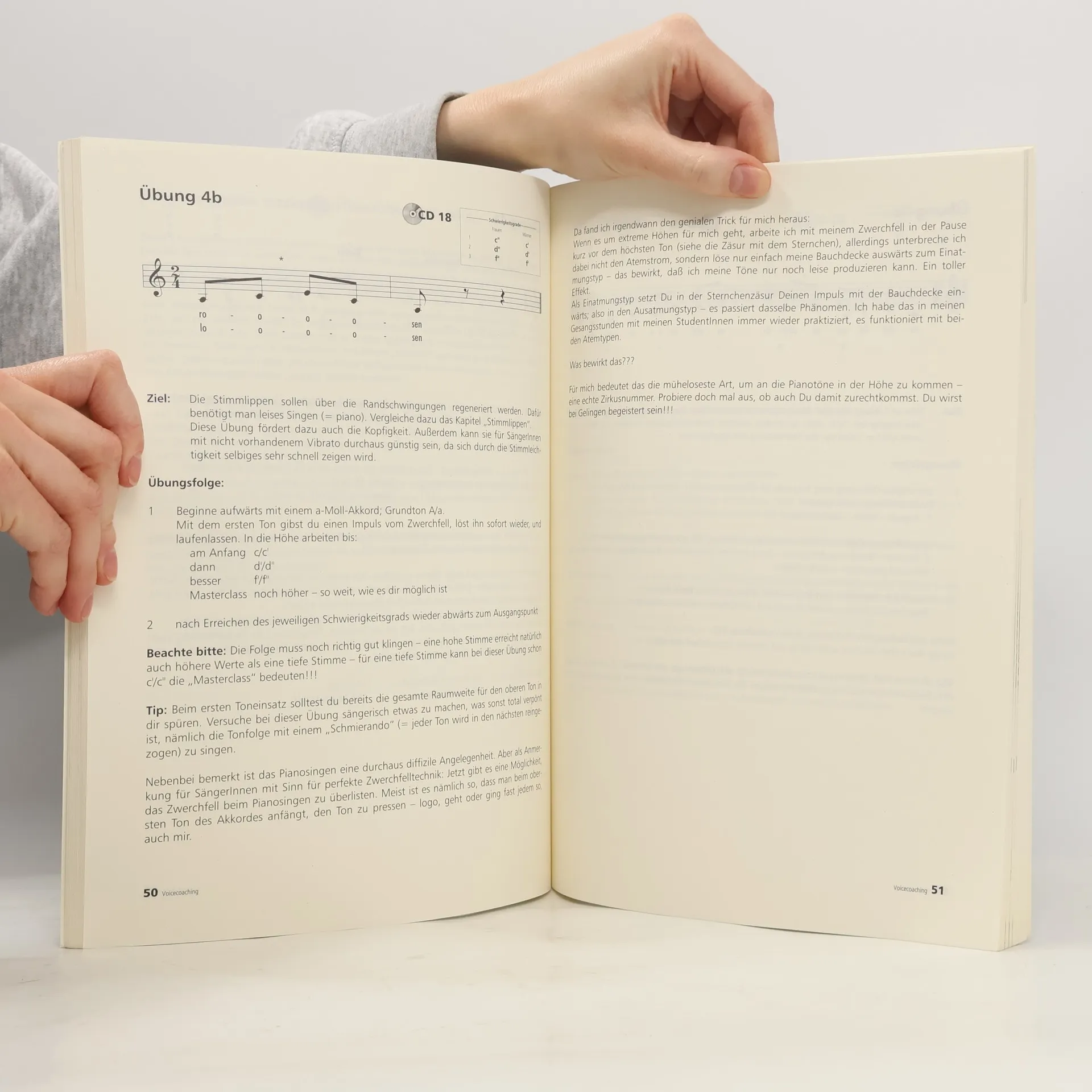 Das Trainingskonzept fr Gesangstechnik Dieses bungsbuch enthlt alles, was SngerInnen fr das tgliche Training, einer sorgflltigen Ausbildung der Stimme und ber die perfekte Atemtechnik wissen sollten. Weiterhin gibt es Hilfestellung bei Stimmproblemen, es werden Interpretationstechniken erarbeitet und Tipps und Tricks vermittelt, die vom Einsingen bis zur Studioarbeit reichen. Die Autorin, selbst Sngerin, vermittelt die Techniken der Profis auf leichtverstndliche Weise. Der Lehrstoff wird durch viele Grafiken und anatomische Zeichnungen aufgelockert. Dieses Buch ist sowohl fr das Selbststudium, als auch als Unterrichtshilfe oder Studienbegleiter konzipiert.