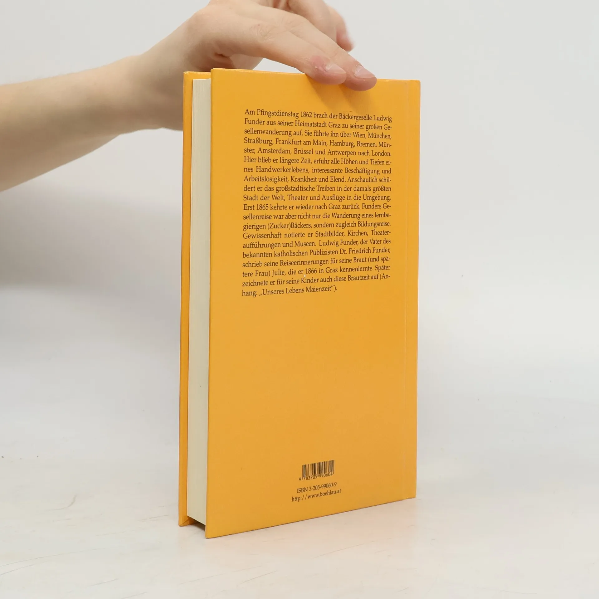 Am Pfingstdienstag 1862 brach der Bäckergeselle Ludwig Funder aus seiner Heimatstadt Graz auf zu seiner großen Gesellenwanderung. Sie führte ihn über Wien, München, Straßburg, Frankfurt am Main, Hamburg, Bremen, Münster, Amsterdam, Brüssel und Antwerpen nach London. Hier blieb er längere Zeit, erfuhr alle Höhen und Tiefen eines Handwerkerlebens, interessante Beschäftigung und Arbeitslosigkeit, Krankheit und Elend. Anschaulich schildert er das großstädtische Treiben in der damals größten Stadt der Welt, Theater und Ausflüge in die Umgebung. Erst 1865 kehrte er wieder nach Graz zurück. Funders Gesellenreise war aber nicht nur die Wanderung eines lernbegierigen (Zucker-)Bäckers, sondern zugleich Bildungsreise. Gewissenhaft notierte er den Zustand des Theaters, die Zahl und den Inhalt der Museen, die er besichtigte. – Ludwig Funder, der Vater des bekannten katholischen Publizisten Dr. Friedrich Funder, schrieb seine Reiseerinnerungen für seine Braut (und spätere Frau) Julie, die er 1866 in Graz kennenlernte. Später zeichnete er für seine Kinder auch diese Brautzeit auf (Anhang: „Unseres Lebens Maienzeit“).