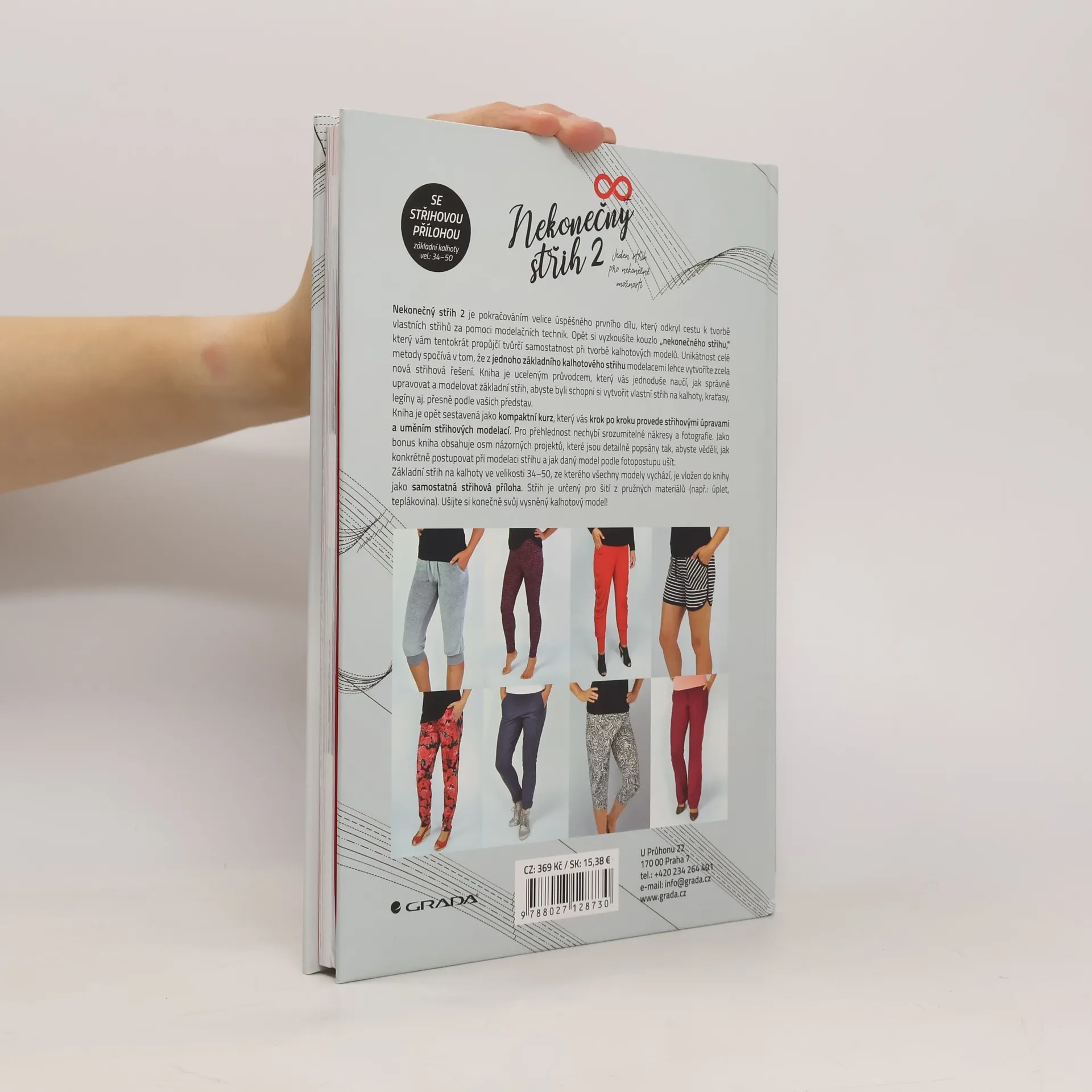 Nekonečný střih 2 je pokračováním úspěšného prvního dílu, který odkrývá tajemství střihových modelací. Tento díl je zaměřený na problematiku kalhotových modelů. Dozvíte se spoustu cenných rad a tipů na úpravu kalhot a opět si ukážeme, jak pomocí jednoho základního střihu lze vytvořit nekonečně mnoho dalších modelů. Díky vložené střihové příloze se základním střihem (vel. 34–50) jsou skvěle padnoucí kalhoty či kraťasy, a s malou úpravou i legíny, konečně na dosah.