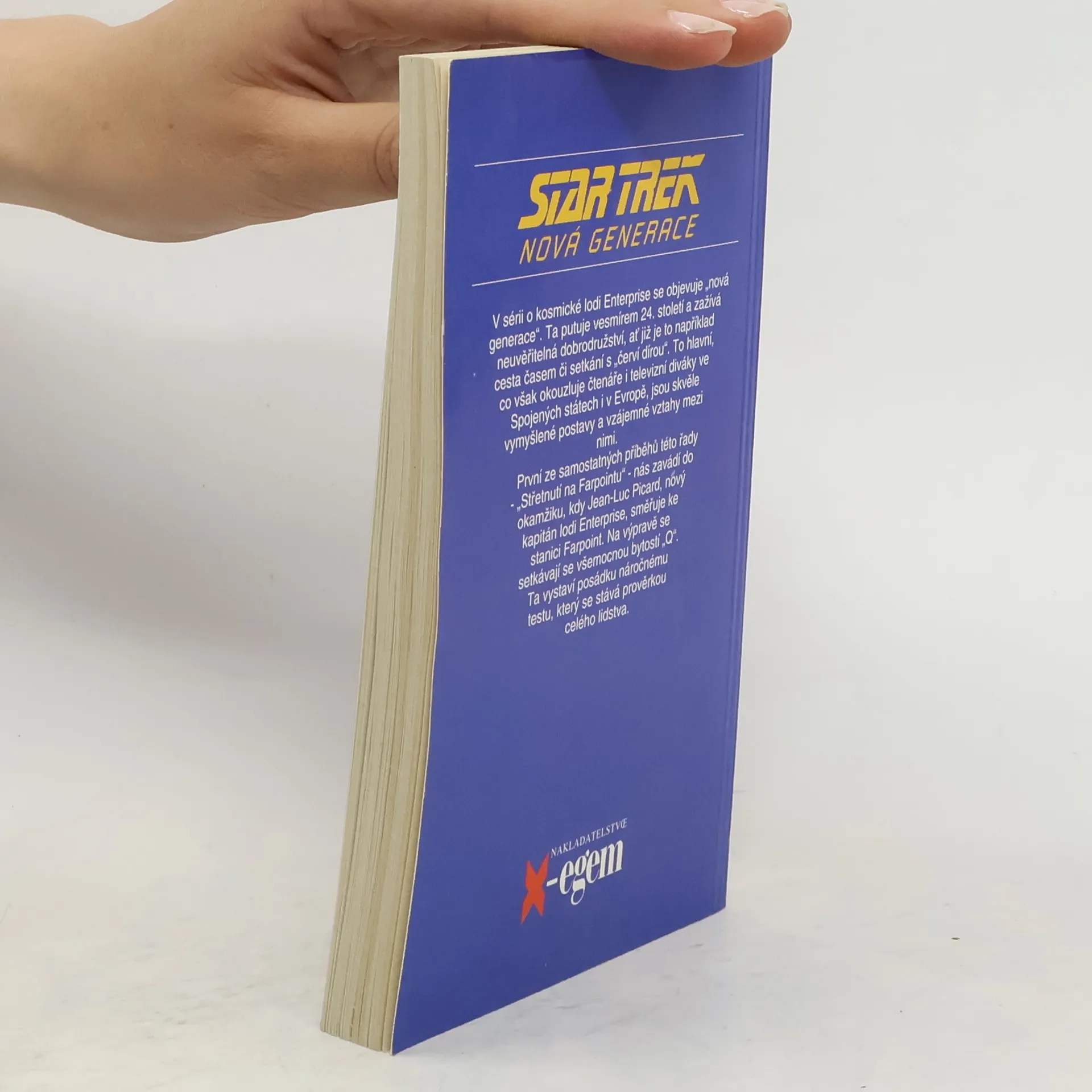 První ze samostatných příběhů této řady - Střetnutí na Farpointu - nás zavádí do okamžiku, kdy Jean-Luc Picard, nový kapitán lodi Enterprise, směřuje ke stanici Farpoint. Na výpravě se setkávají se všemocnou bytostí „Q". Ta vystaví posádku náročnému testu, který se stává prověrkou celého lidstva. Po velkém úspěchu první televizní série Star Trek se objevilo v roce 1987 její pokračování pod označením Nová generace. Nový typ vesmírné lodi Enterprise, na jejíž palubě žije přes tisíc osob, řídí posádka „nové generace" - kapitán Jean-Luc Pikard, první důstojník William Riker, android Dat, lodní poradkyně Deanna Troi, mladý slepý poručík Geordi La Forge a další. Vzápětí po příznivé odezvě televizních diváků ve Spojených státech i v Evropě se objevily i první romány, napsané osvědčenými autory americké sci-fi literatury.