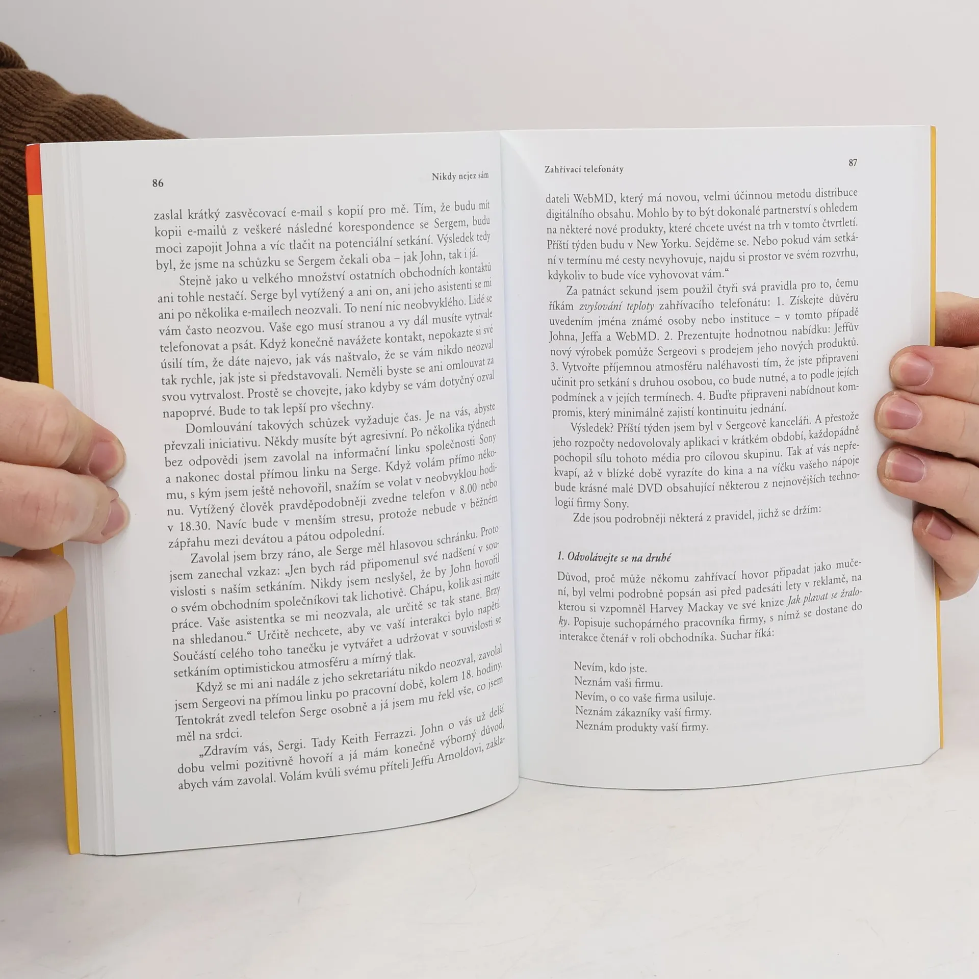 Kniha Keitha Ferrazziho pojednává o potřebě networkingu a upevňování lidských vztahů jako nezbytné součásti strategie pro úspěšné postavení v dnešním světě. Popisuje konkrétní kroky a způsob uvažování, které její autor používá k tomu, aby udržoval těsné spojení s tisícovkou spolupracovníků a přátel. Podle Ferrazziho totiž existuje proces nebo systém, chcete-li, který s budováním sítě souvisí. Nejde o žádné kouzlo, vyhrazené jen pro několik málo vyvolených s vrozeným darem sociální komunikace. Kontaktování druhých závisí pouze na tom, že si dopředu vytvoříte plán a budete ho plnit. Ferrazzi přitom důsledně odlišuje navazování vztahů na základě jejich účelového, primitivního, desperátského vytěžování, které je obvykle s „networkingem“ spojováno, jeho forma spojení se světem se zakládá na velkorysosti a vzájemné pomoci. Vedle vlastních zkušeností autor nabízí i pohled na nadčasové strategie těch „nejpropojenějších“ lidí na světě, například Billa Clintona či dalajlámy.