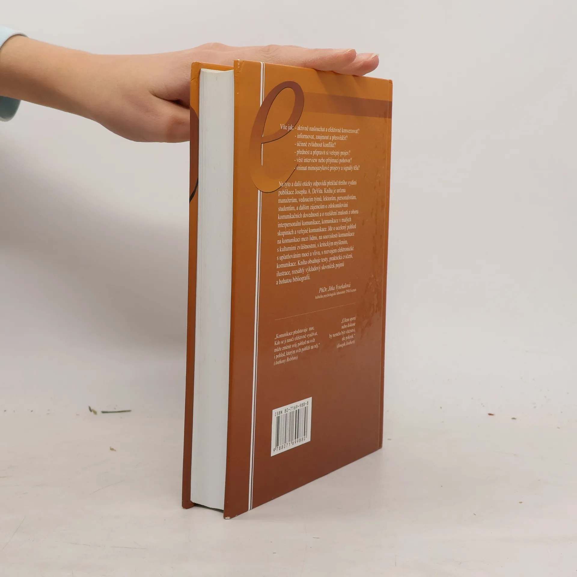 Víte jak: - aktivně naslouchat a efektivně konverzovat? - informovat, zaujmout a přesvědčit? - účinně zvládnout konflikt? - přednést a připravit si veřejný projev? - vést interview nebo přijímací pohovor? - vnímat mimojazykové projevy a signály těla? Na tyto a další otázky odpovídá překlad třetího vydání publikace Josepha A. DeVita. Kniha je určena manažerům, vedoucím týmů, lektorům, personalistům, studentům, a dalším zájemcům o zdokonalování komunikačních dovedností a o rozšíření znalsotí z oboru interpersonální komunikace, komunikace v malých skupinách a veřejné komunikace. Jde o ucelený pohled na komunikaci mezi lidmi, na souvislosti komunikace s kulturními zvláštnostmi, s kritickým myšlením, s uplatňováním moci a vlivu, s rozvojem elektronické komunikace. Kniha obsahuje testy, praktická cvičení, ilustrace, rozsáhlý výkladový slovníček pojmů a bohatou bibliografií.... celý text
