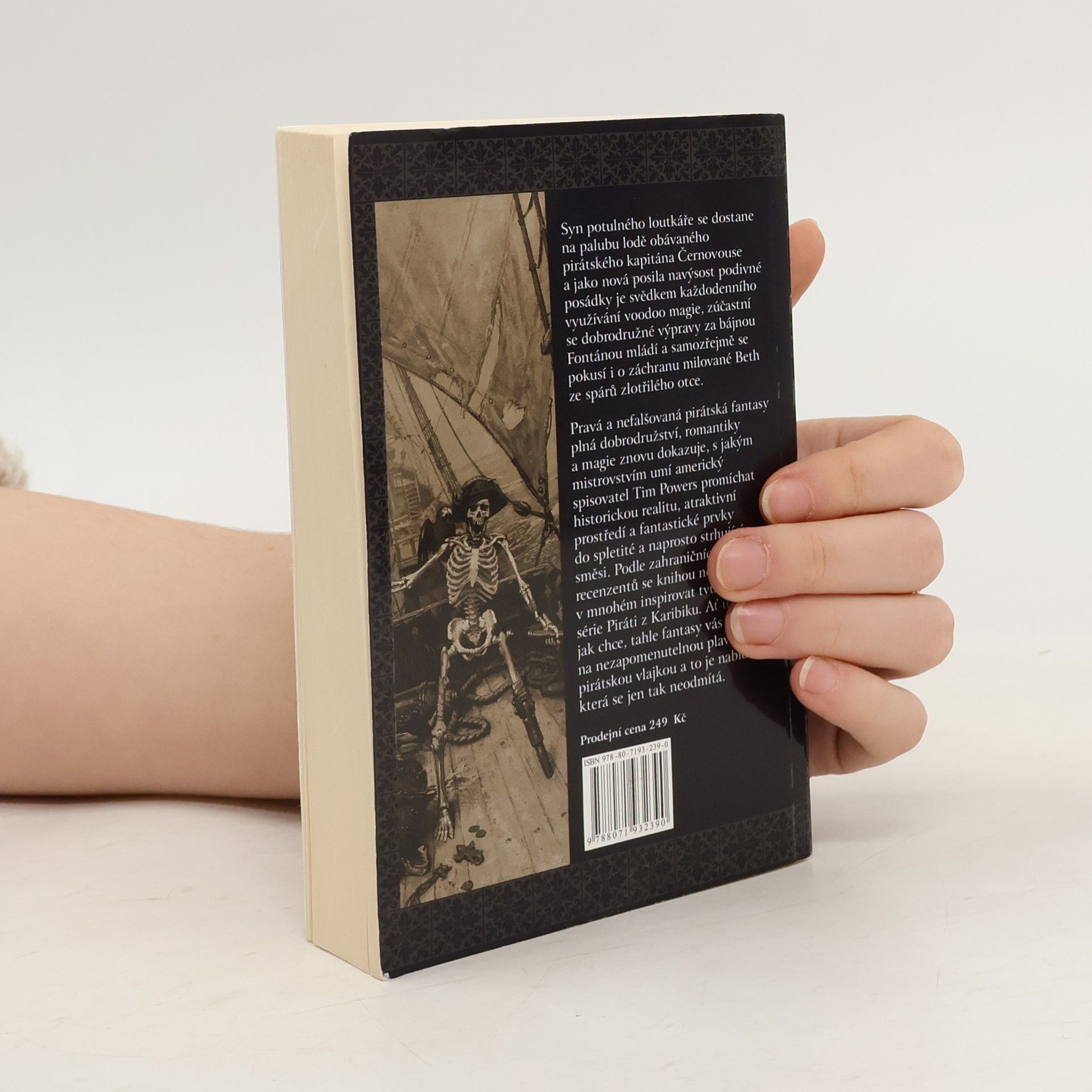 Syn potulného loutkáře se dostane na palubu lodě obávaného pirátského kapitána Černovouse a jako nová posila navýsost podivné posádky je svědkem každodenního využívání voodoo magie, zúčastní se dobrodružné výpravy za bájnou Fontánou mládí a samozřejmě se pokusí i o záchranu milované Beth ze spárů zlotřilého otce. Pravá a nefalšovaná pirátská fantasy plná dobrodružství, romantiky a magie znovu dokazuje, s jakým mistrovstvím umí americký spisovatel Tim Powers promíchat historickou realitu, atraktivní prostředí a fantastické prvky do spletité a naprosto strhující směsi. Podle zahraničních recenzentů se knihou nechali v mnohém inspirovat tvůrci filmové série Piráti z Karibiku. Ať už je to jak chce, tahle fantasy vás vezme na nezapomenutelnou plavbu pod pirátskou vlajkou a to je nabídka, která se jen tak neodmítá.