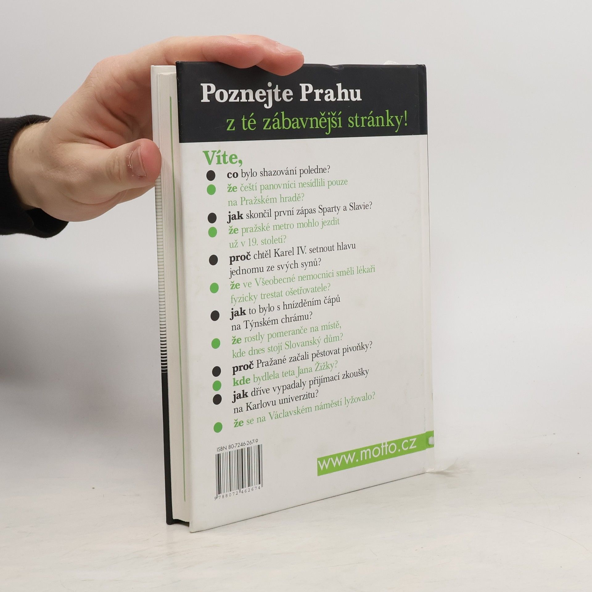 Kniha Vám dá odpověď na řadu otázek spojených s historií Prahy. Dovíte se, že čeští panovníci nesídlili pouze na Pražském hradě, jak skončil první zápas Sparty a Slavie, že pražské metro mohlo jezdit už v 19. století či proč chtěl Karel IV. setnout hlavu jednomu ze svých synů. Dále pak jak to bylo s hnízděním čápů na Týnském chrámu, že rostly pomeranče na místě, kde dnes stojí Slovanský dům a proč Pražané začali pěstovat pivoňky, jak dříve vypadaly přijímací zkoušky na Karlovu univerzitu a kdy se na Václavském náměstí lyžovalo.