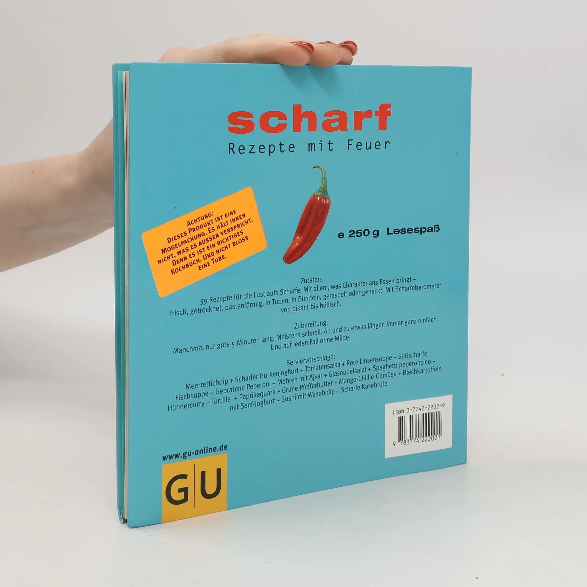 Manche moegen es scharf. Und das sind immer mehr. Nicht fad, nicht langweilig, sondern mit Pfiff, Aroma und Charakter. Pikant und feurig sind die neuen Rezepte von Cornelia Schinharl. Mit frechen Texten, Tipps und Animationen garniert, ueberleben sie im wasserfesten Einband auch die Loescharbeiten in der Chaotenkueche. Unkonventionelle Foodfots, Steckbriefe der Scharfmacher, Fundquellen vom Asienshop bis zum Gemuesehaendler, Sicherheitsverwahrung fuer die scharfen Sachen - alles drin in der Theorie. Und im Rezeptteil: Scharfes fuer viel Zeit oder wenig, und Scharfes fuer die grosse Runde.