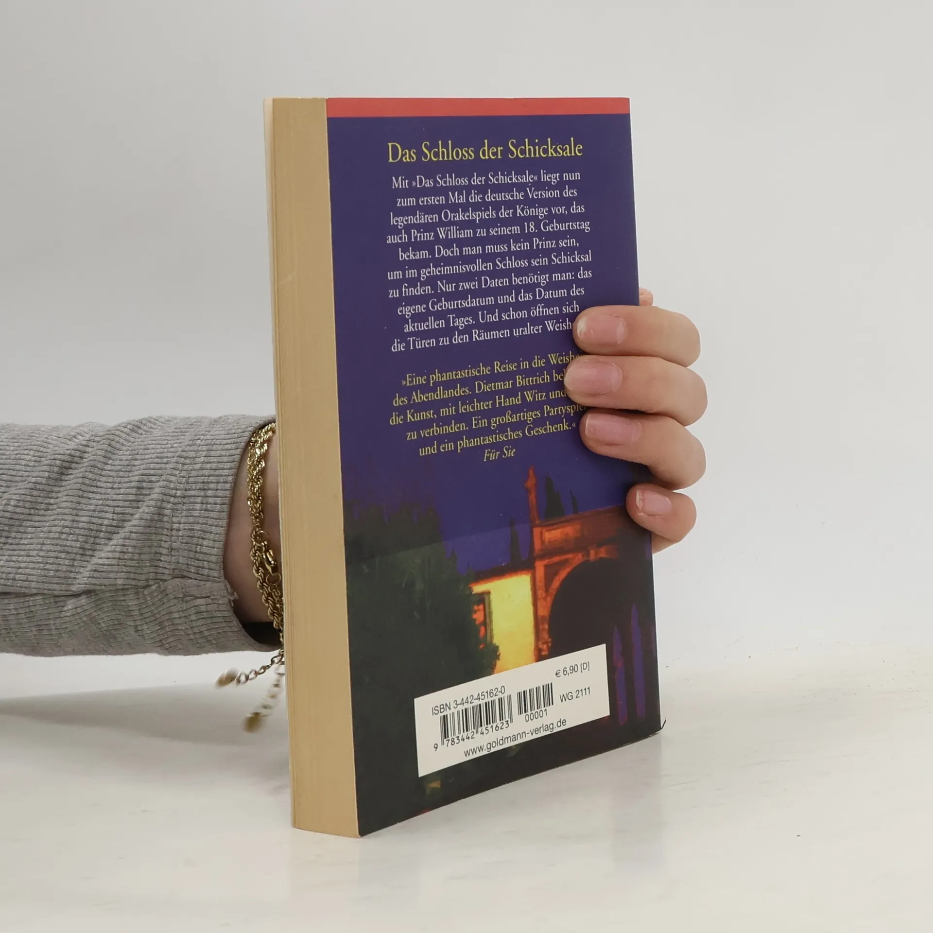 Prinz William hat dieses Orakelspiel zum 18. Geburtstag bekommen. Seit dem Mittelalter kursiert „Das Schloss der Schicksale“ an den Königshöfen des Abendlandes. Auf der Basis der erhaltenen Texte hat Dietmar Bittrich das alte Spiel in die Sprache unserer Zeit übertragen. Sie können „Das Schloss der Schicksale“ sofort spielen. Sie benötigen lediglich zwei Daten: Ihren Geburtstag und das Datum des heutigen Tages. Und schon öffnen sich die Türen zu den Räumen uralter Weisheit.