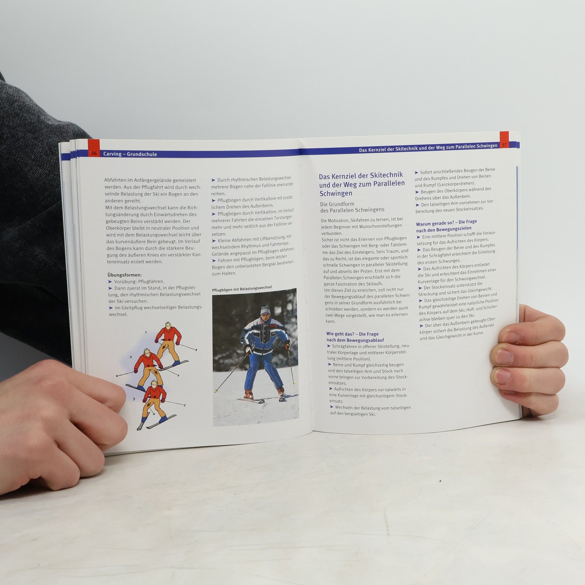 Für Anfänger und 'Umsteiger': Kondition, Carvingtechnik, paralleles Schwingen; Varianten der Technik in verschiedenem Gelände, auf der Buckelpiste und auf harten Pisten; Hohe Schule im Gelände; kleine Lawinenkunde. Bildanteil ca. 35%