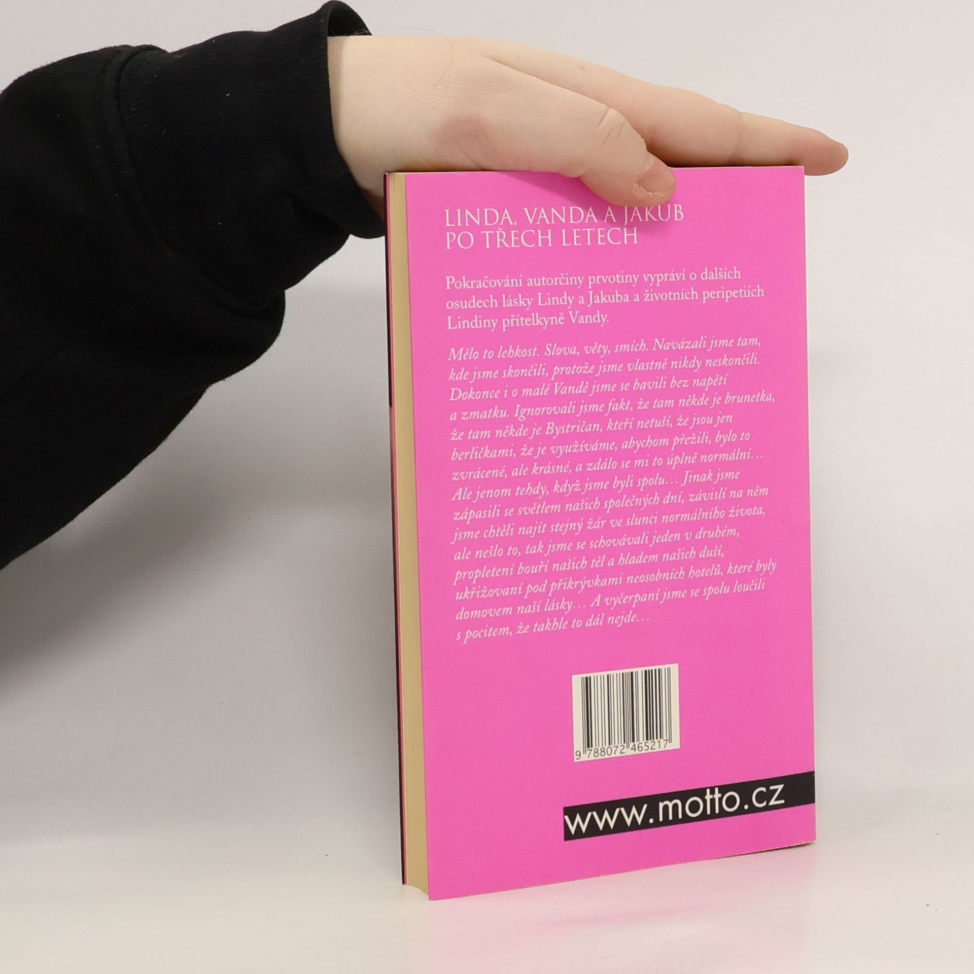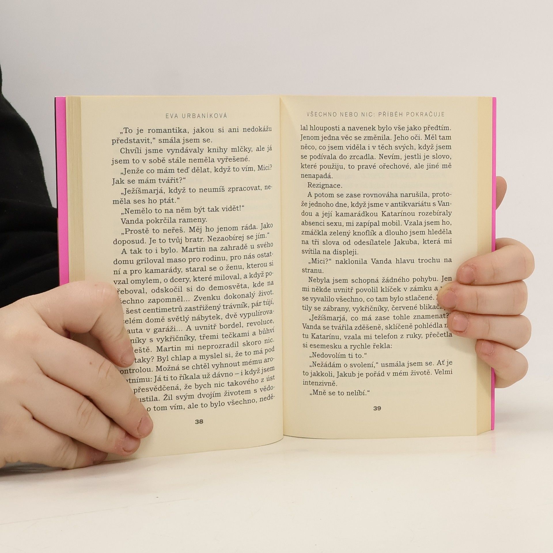 Po třech letech se autorka vrací k hrdinům předcházející knihy "Všechno nebo nic" Lindě, Vandě a Jakubovi, aby, podle vlastních slov, jejich příběh uzavřela. Skončí happyendem????? Mělo to lehkost. Slova, věty, smích. Navázali jsme tam, kde jsme skončili, protože jsme vlastně nikdy neskončili. Dokonce i o malé Vandě jsme se bavili bez napětí a zmatku. Ignorovali jsme fakt, že tam někde je brunetka, že tam někde je Bystričan, kteří netuší, že jsou jen berličkami, že je využíváme, abychom přežili, bylo to zvrácené, ale krásné, a zdálo se mi to úplně normální… Ale jenom tehdy, když jsme byli spolu… Jinak jsme zápasili se světlem našich společných dní, závislí na něm jsme chtěli najít stejný žár ve slunci normálního života, ale nešlo to, tak jsme se schovávali jeden v druhém, propletení bouří našich těl a hladem našich duší, ukřižovaní pod přikrývkami neosobních hotelů, které byly domovem naší lásky… A vyčerpaní jsme se spolu loučili s pocitem, že takhle to dál nejde
