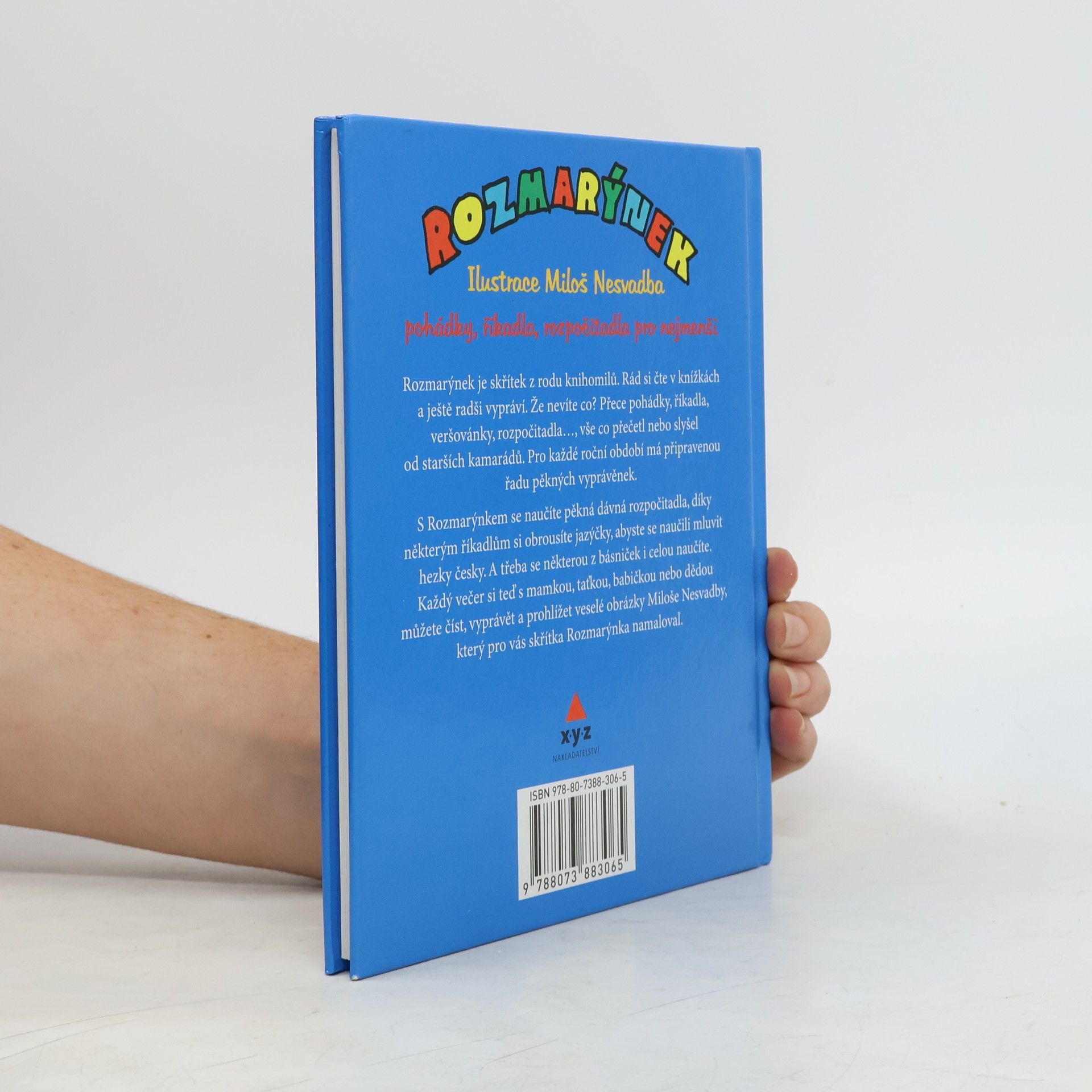 Pohádky, říkadla, rozpočitadla pro nejmenší čtenáře i jejich rodiče. Rozmarýnek je malý, neposedný skřítek, který dětem přináší veselé pohádky, svižná rozpočitadla a spoustu říkanek a veselých básniček. Je i pomocníčkem rodičů, kteří nějaký ten verš třeba už pozapomněli a ne a ne si vzpomenout. Co on vám už přečetl pohádek a bájí. Nevěřili byste, kolik básniček, říkánek, rozpočitadel a hádanek tenhle malý klučina zná. Protože není lakomý, tak se s vámi o některé příběhy podělí. Bude vám vyprávět pohádky dlouhé i docela kraťoulinké, připomene polozapomenuté básničky a naučí i řadu veselých rozpočitadel. To abyste na jaře, až si budete s ostatními dětmi hrát venku třeba na babu, se rychle dozvěděli, kdo půjde pikat. Rozmarýnek – kamarád – pohádky vypráví rád! S nimi také básničky, pro kluky i holčičky. Máma, táta, děda, babi s Rozmarýnkem ví si rady! Knížku jenom otevřou – a už jenom čtou a čtou…