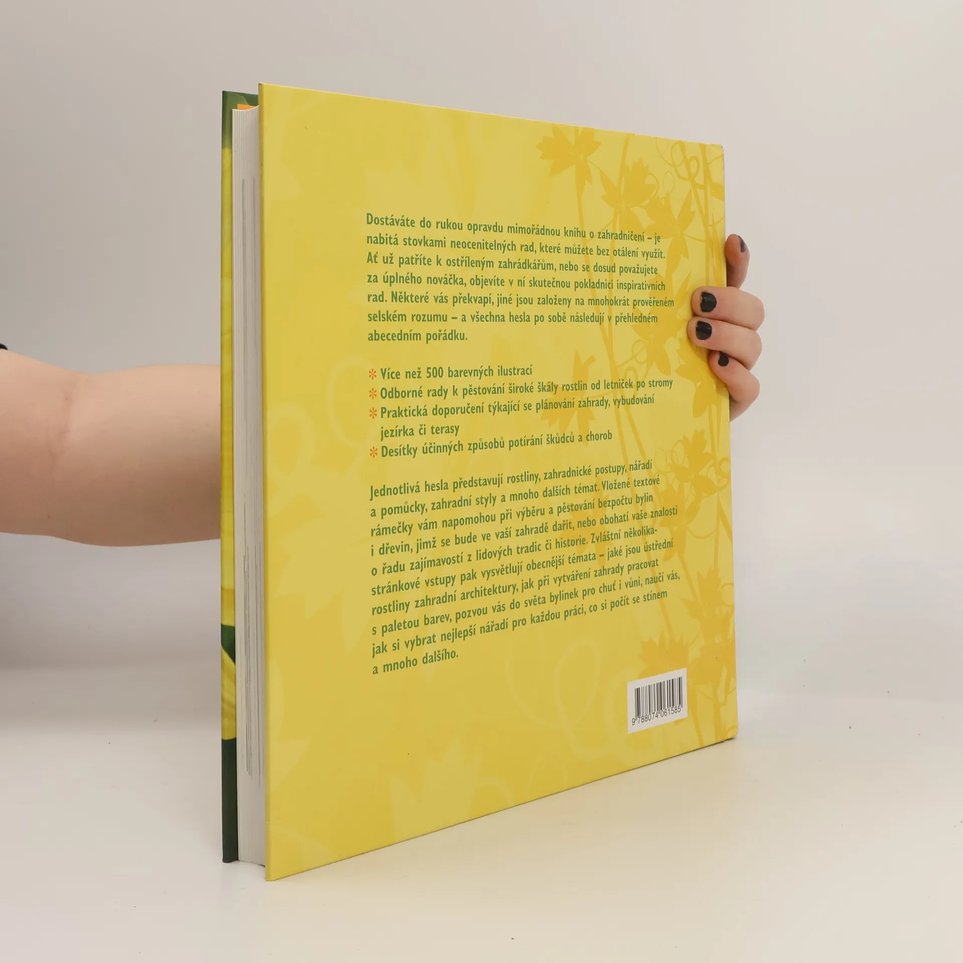 Publikace 1000 nápadů a rad pro zahrádkáře se stane vaším neocenitelným pomocníkem a průvodcem ať už máte velikánskou záhradu s mnoha záhony a ovocným sadem, nebo se těšíte jen z malého proužku předzahrádky. V abecedně řazeném rejstříku hesel najdete rostliny, zahradnické postupy, nářadí a pomůcky, zahradní styly a mnoho dalších témat. Vložené textové rámečky vám pomohou při výběru a úspěšném pěstování velkého množství bylin i dřevin nebo obohatí vaše znalosti o řadu zajímavostí z lidových tradic či historie. Zvláštní několikastránkové vstupy pak vysvětlují obecnější témata – ústřední rostliny zahradní architektury, výběr barev při vytváření zahrady, svět bylinek pro chuť i vůni, využití siluet a tvarů rostlin, nejlepší nářadí pro každou práci, co si počít se stínem a další. Kniha obsahuje stovky užitečných ilustrací i působivých fotografií a nechybí ani podrobný rejstřík.