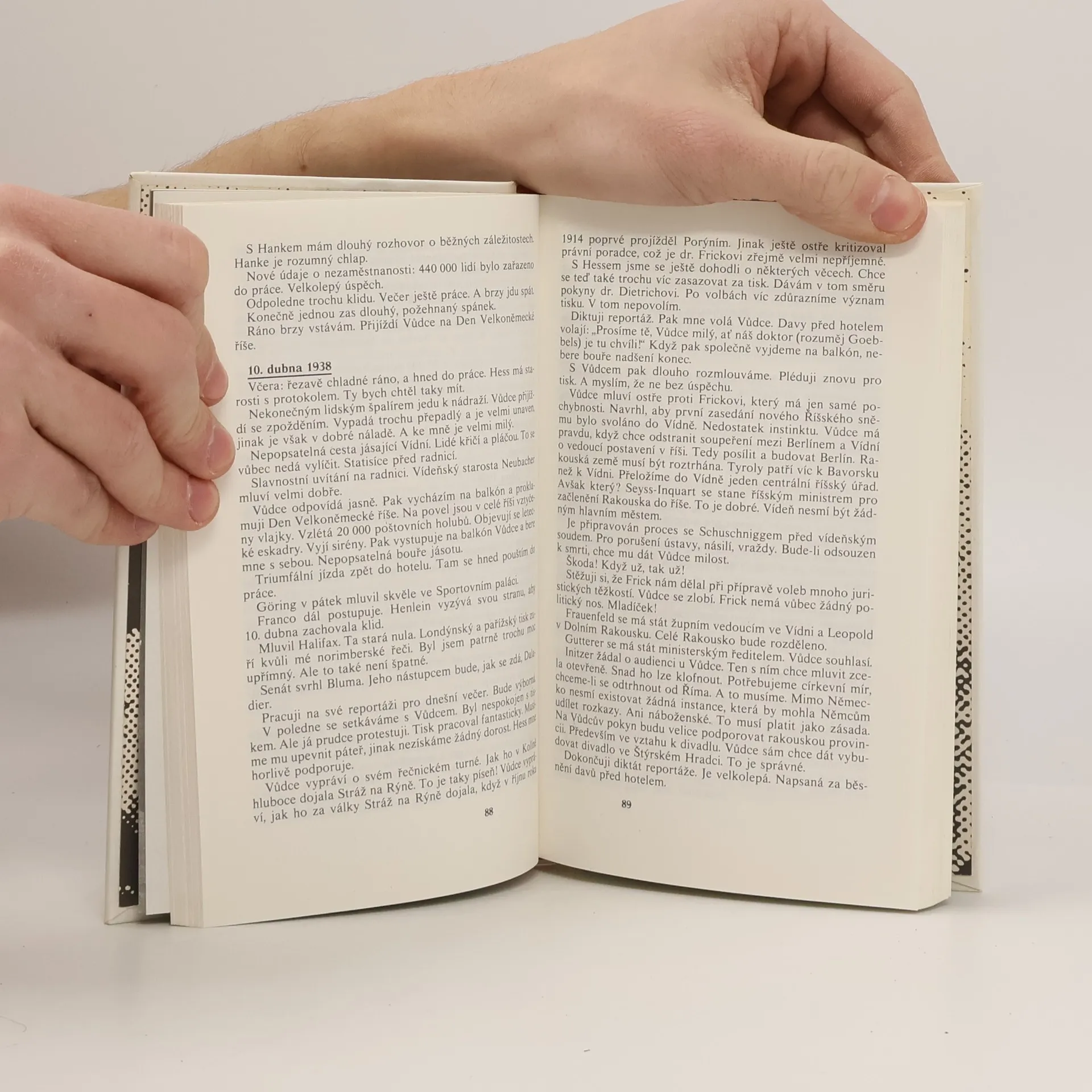 Autentický deník jednoho z nejvyšších pohlavárů nacistického Německa, ministra propagandy. Pro nás jsou zajímavé zejména zápisky z roku 1938, například poznámky na téma jak je důležité, aby Němci získali tajně do vlastnictví některé francouzské noviny (jak překvapivé, že se v nich pak začaly objevovat články proti spojenectví s Československem) nebo o tom, že Hitler považoval prezidenta Beneše za velmi nebezpečného protivníka.... celý text