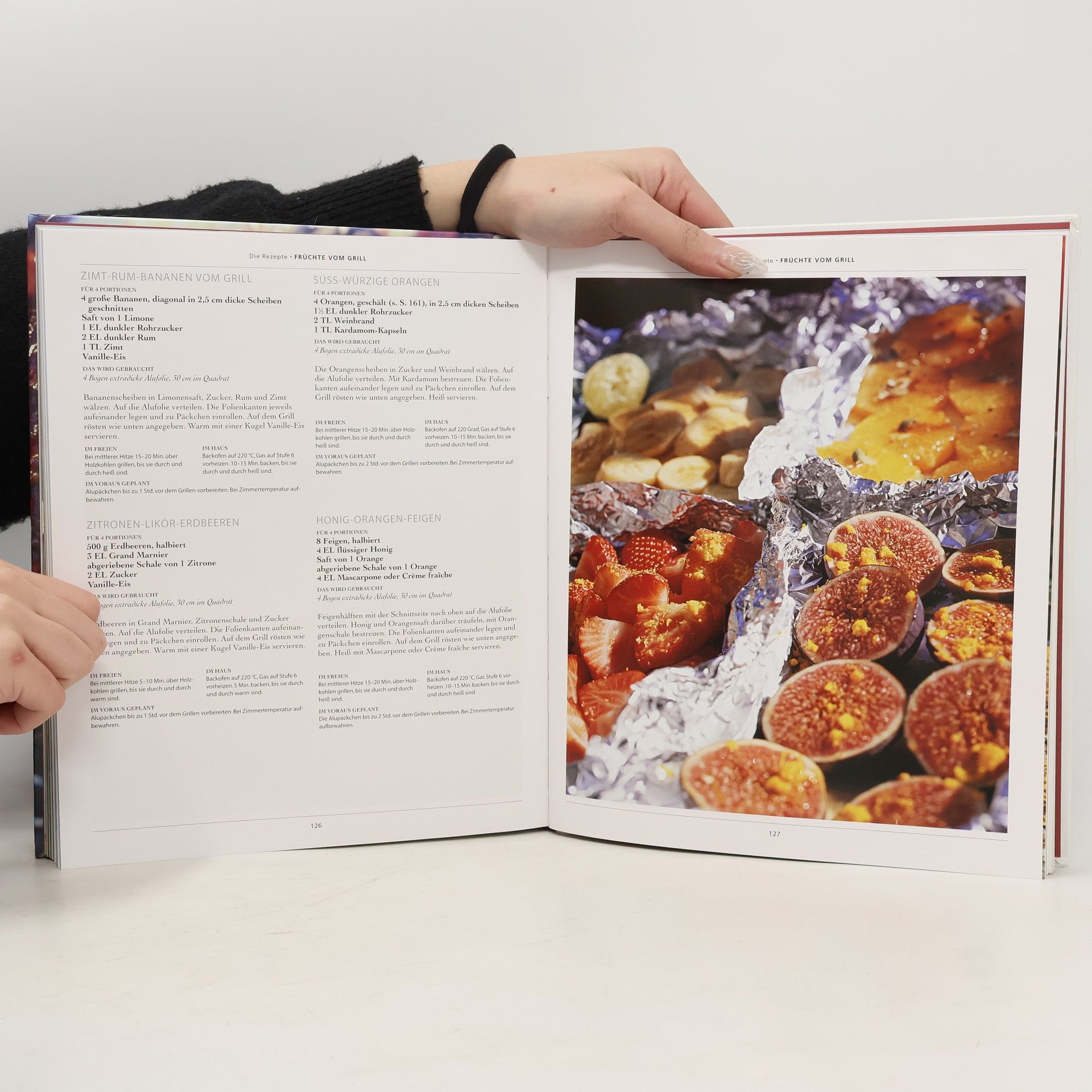 Reich illustrierte Rezeptideen rund ums Grillen von Fleisch, Fisch, Meeresfrüchten, Gemüse, Früchten etc. mit Dips, Saucen, Salaten u.a.