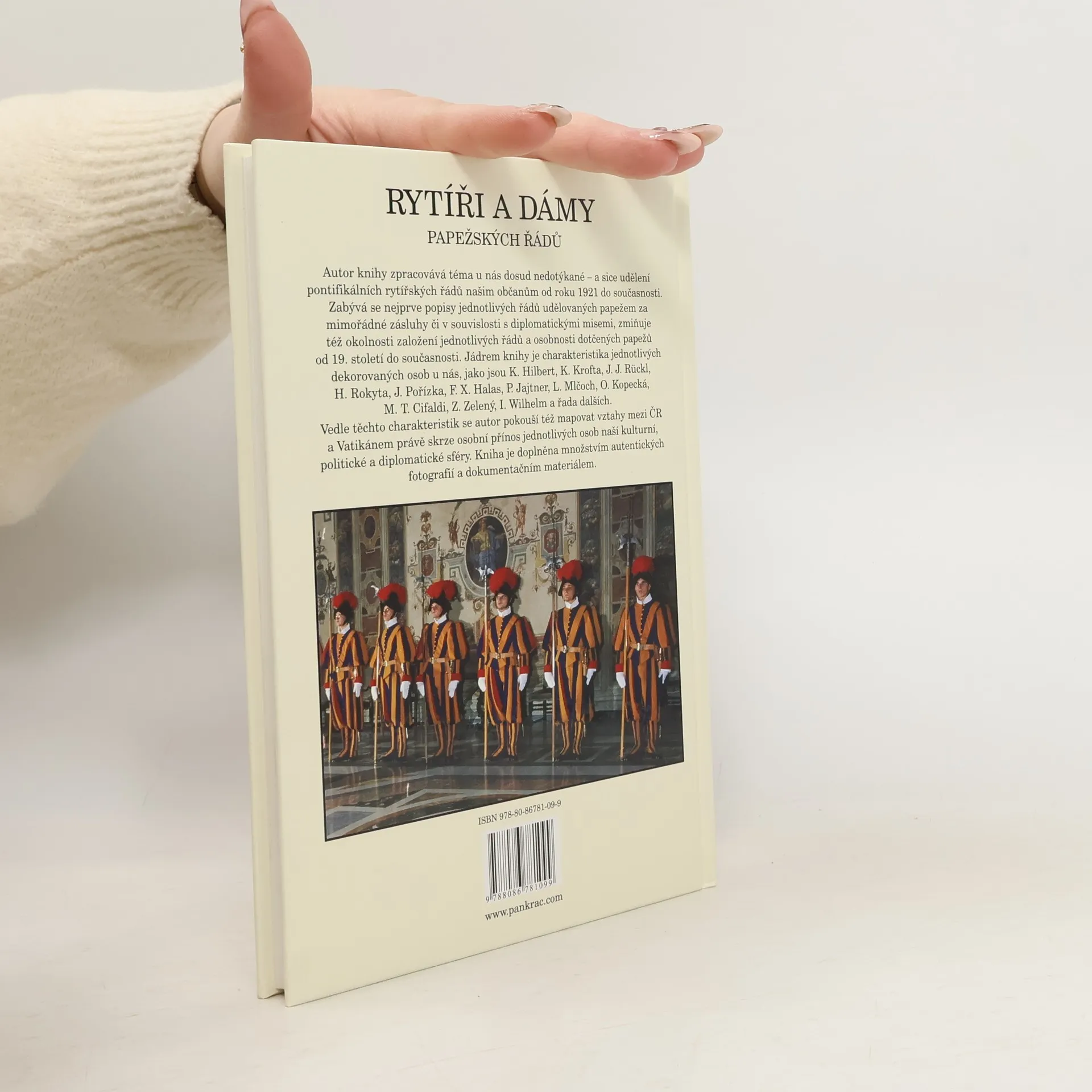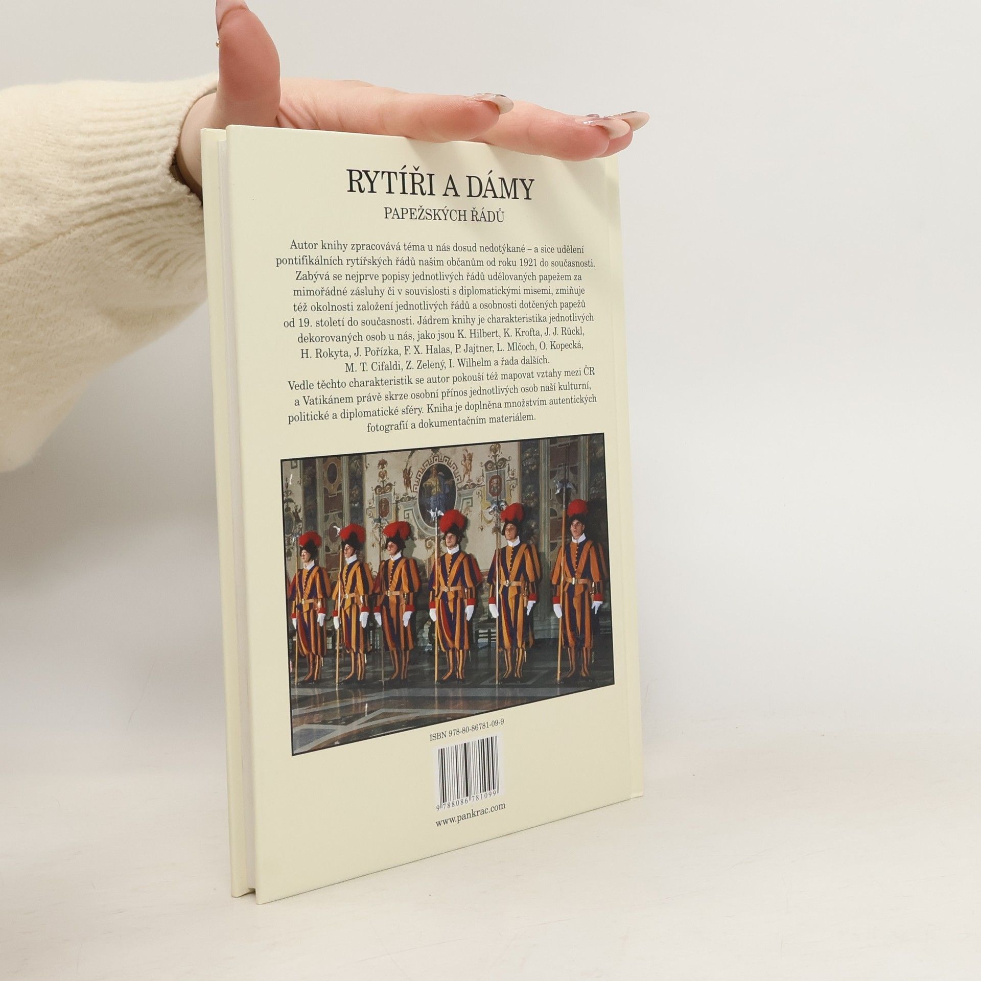 Autor knihy zpracovává téma u nás dosud nedotýkané a sice udělení pontifikálních rytířských řádů našim občanům od roku 1921 do současnosti. Zabývá se nejprve popisy jednotlivých řádů udělovaných papežem za mimořádné zásluhy či v souvislosti s diplomatickými misemi, zmiňuje též okolnosti založení jednotlivých řádů a osobnosti dotčených papežů od 19. století do současnosti. Jádrem knihy je charakteristika jednotlivých dekorovaných osob u nás, jako jsou K. Hilbert, K. Krofta, J. J. Rückl, H. Rokyta, J. Pořízka, F. X. Halas, P. Jajtner, L. Mlčoch, O. Kopecká, M. T. Cifaldi, Z. Zelený, I. Wilhelm a řada dalších. Vedle těchto charakteristik se autor pokouší též mapovat vztahy mezi ČR a Vatikánem právě skrze osobní přínos jednotlivých osob naší kulturní, politické a diplomatické sféry. Kniha je doplněna množstvím autentických fotografií a dokumentačním materiálem. Zařazeno v kategoriích