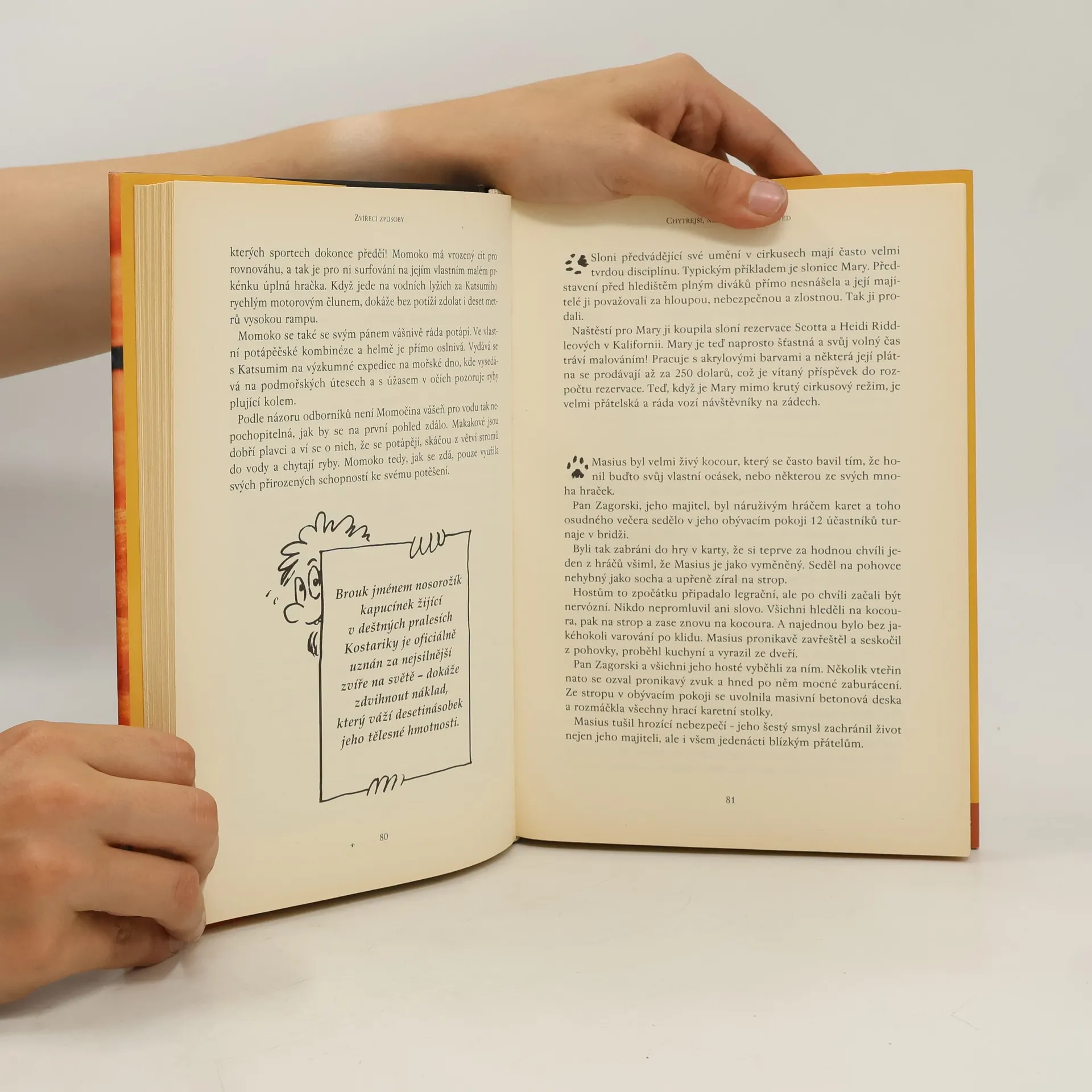 Kočky umí získat koláče bez práce, přístřeší bez ztráty svobody a lásku bez trestů. Bůh stvořil kočku, aby lidé mohli mít potěšení z hladění tygra. V Egyptě byly kočky mumifikovány stejně jako lidé, přičemž některým byly do hrobů přidávány mumifikované myši, aby měly co jíst i po smrti. Kdyby se kočka dala křížit s člověkem, prospělo by to člověku, ale kočka by tím utrpěla. Pes má v životě jediný cíl - věnovat vám své srdce. Mezi fascinujícími zvířaty se nachází nosorožík kapucínek z kostarických deštných pralesů, oficiálně uznávaný jako nejsilnější zvíře na světě, schopný zvednout náklad desetinásobku své hmotnosti. Blecha má neuvěřitelné skokanské schopnosti, dokáže skočit 60 cm, což by odpovídalo 400 metrům pro člověka, kdybychom to porovnali podle váhy. Tyto příběhy a fakta ukazují, jak jsou zvířata fascinující a jak se s nimi pojí různé mýty a skutečnosti.