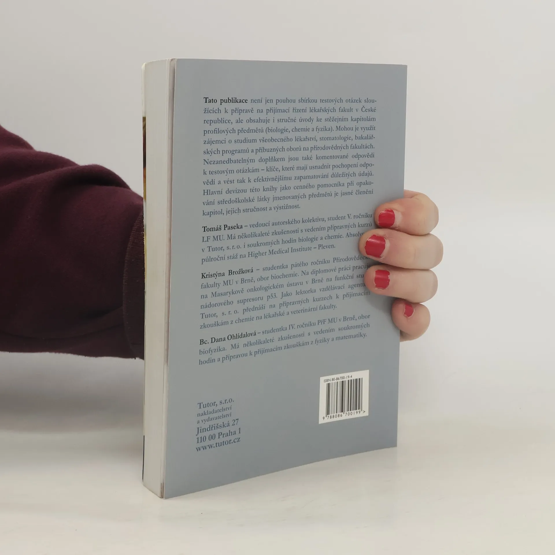 Publikace obsahuje testové otázky jednotného formátu rozdělené do kapitol v předmětech biologie, chemie, fyzika. Každá kapitola začíná úvodem, který shrnuje danou látku. Pro lepší pochopení problému jsou k otázkám připojeny komentované klíče. Poměrné zastoupení otázek v jednotlivých kapitolách zhruba odpovídá zastoupení v přijímacích testech. Všechny otázky byly sestaveny dle zkušeností autorů z výuky v přípravných kurzech v Tutor s. r. o.