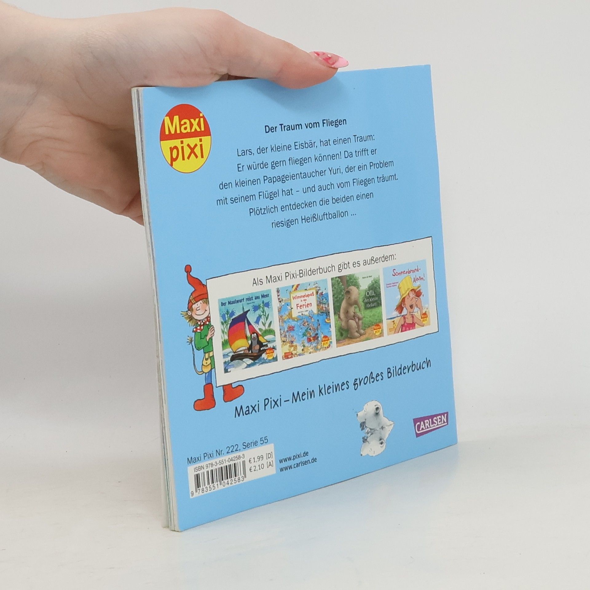 Lars, der kleine Eisbär, hat einen Traum: Er würde gern fliegen können! Da trifft er den kleinen Papageientaucher Yuri, der ein Problem mit seinem Flügel hat – und auch vom Fliegen träumt. Plötzlich entdecken die beiden einen riesigen Heißluftballon... Maxi Pixi – die kleinen großen Bilderbücher im Softcover.