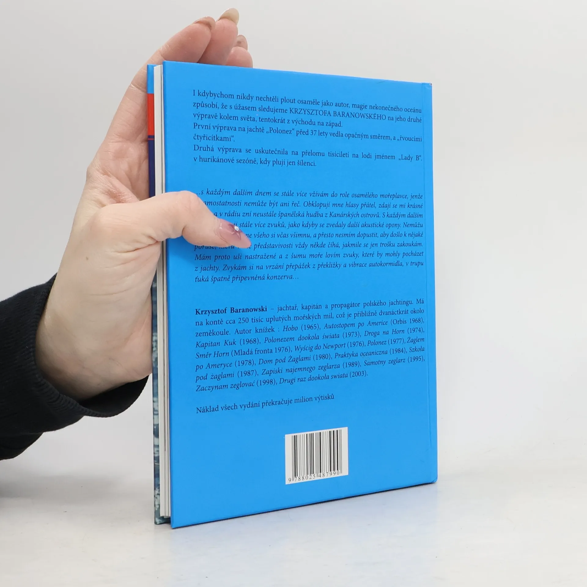 Krzysztof Baranowski jachtař, kapitán a propagátor polského jachtingu. Má na kontě cca 250.000 uplutých námořních mil, což je přibližně dvanáctkrát kolem zeměkoule. První výpravu kolem světa na jachtě "POLONEZ" vedl "řvoucími čtyřicítkami" ze západu na východ před 37 lety. Druhá výprava na lodi jménem "Lady B.", o které pojednává tato kniha, se uskutečnila na přelomu tisíciletí v hurikánové sezoně, kdy plují jen šílenci, z východu na západ