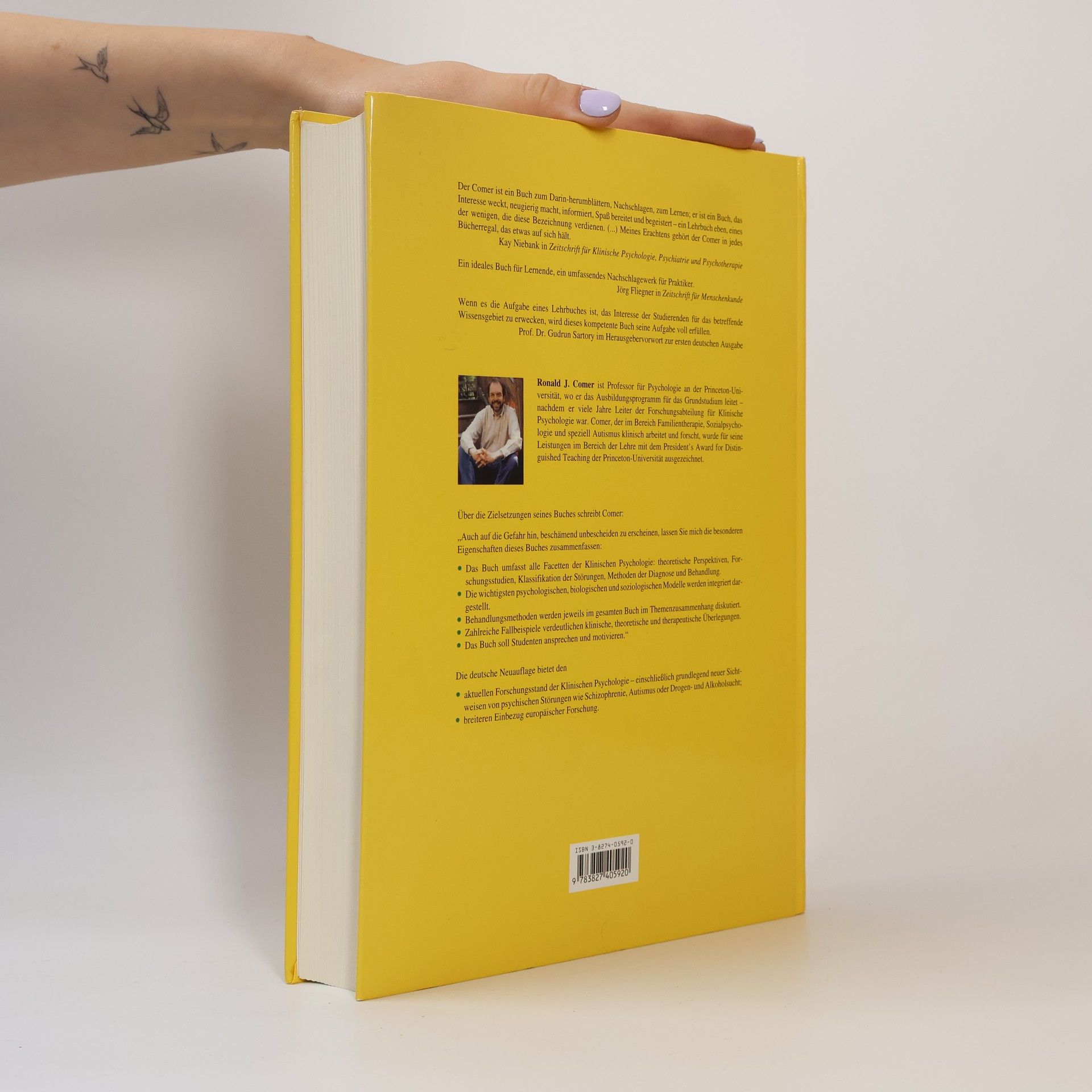 (Autor) Ronald J. Comer (Titel) Klinische Psychologie (copy) „Der Comer ist ein Buch zum Darin-herumblättern, Nachschlagen, zum Lernen; er ist ein Buch, das Interesse weckt, neugierig macht, informiert, Spaß bereitet und begeistert - ein Lehrbuch eben, eines der wenigen, die diese Bezeichnung verdienen.“ Zeitschrift für Klinische Psychologie, Psychiatrie und Psychotherapie „(...) überaus gut lesbar, verständlich und zugleich kompetent, bietet dieses Lehrbuch nicht nur einen Überblick über den relevanten Prüfungsstoff für Absolventen des Psychologiestudiums, sondern kann ebenso praktisch tätigen Psychotherapeuten aber auch Allgemeinmedizinern (...) als umfangreiches Nachschlagewerk dienen (...).“ psychotherapie. org (Biblio) 2. Aufl. 2001, 672 S., 104 s/w Abb., 91 farb. Abb., geb.