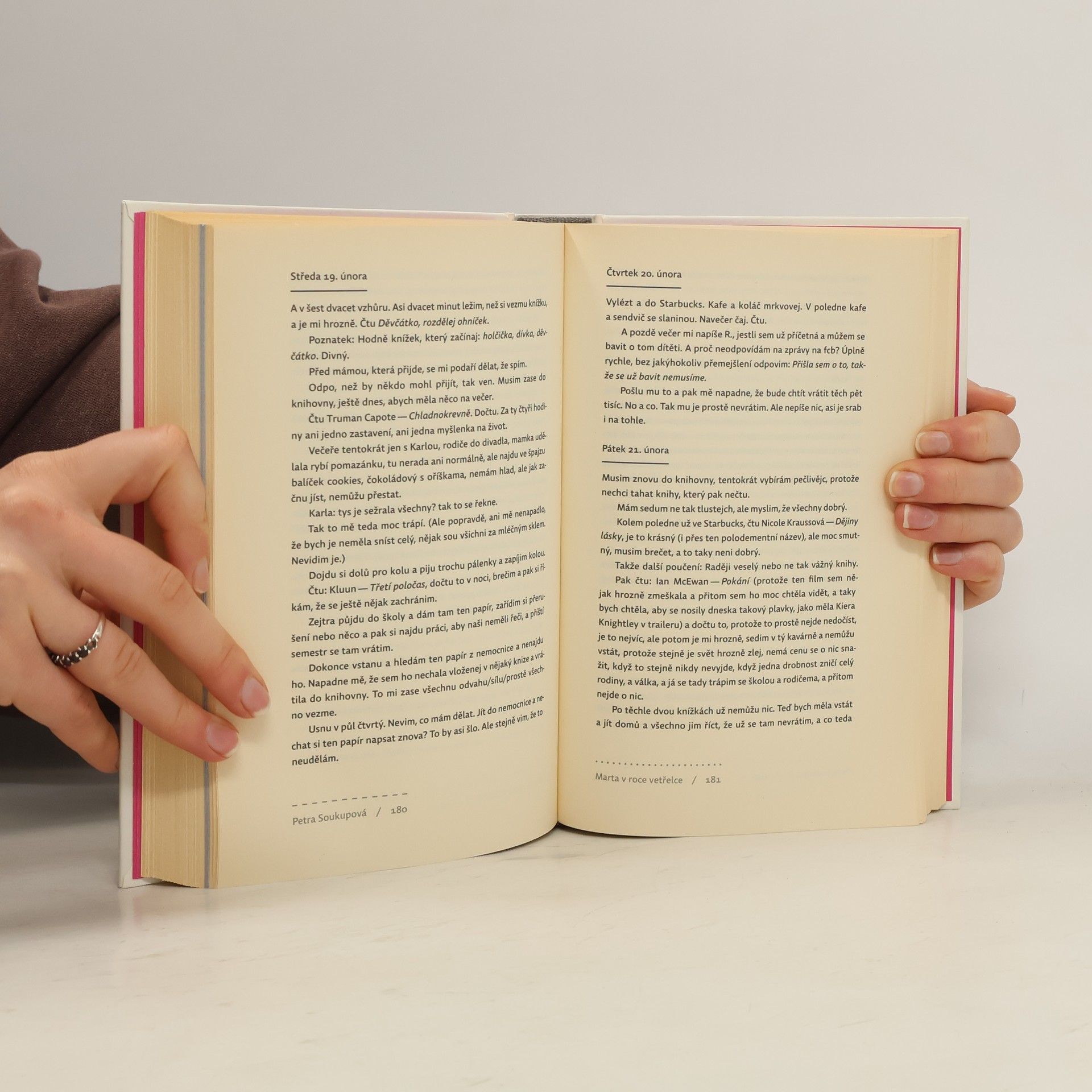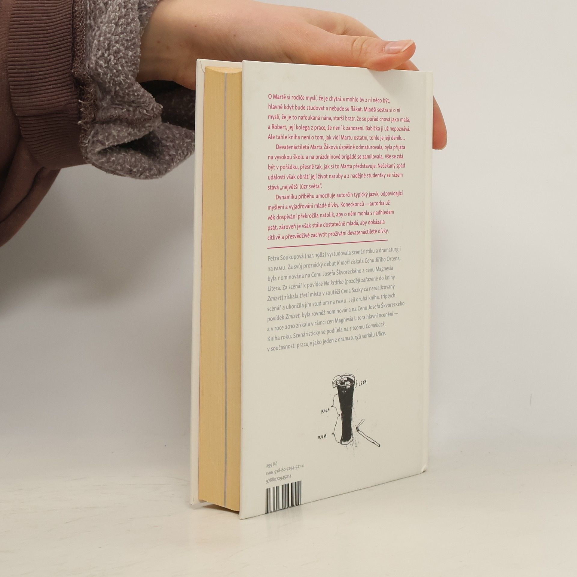 Martě je čerstvých devatenáct let, je hezká, chytrá, a v životě jí jde všechno snadno. Právě se dostala na vysokou školu a těší se na nový život. Jediné, co ji trápí, je jizva v obličeji. O prázdninách proto nastoupí na brigádu, aby si vydělala na plastickou operaci a začala svůj dospělý život s novou tváří. A právě tady začíná řetězec dramatických událostí, které Martě dokonale převrátí život. Na brigádě se bezhlavě zamiluje do Roberta a zcela se na něj upne. Záhy zjišťuje, že je těhotná a Robert je ve skutečnosti ženatý. Rozhodne se pro potrat, ale matka ji přinutí si dítě nechat, aby se o něj sama mohla starat. Martin život je v troskách, představy o budoucnosti, studiu, lásce, rodině se jí hroutí. Ví, že roli, která se od ní očekává, nedokáže zvládnout, a balancuje na hraně deprese a vzpoury. Krizi řeší útěky, alkoholem a sebepoškozováním. Nová kniha Petry Soukupové je stylizovaná jako deník dospívající dívky, náhle vržené do dospělosti. Soukupová opět dokazuje, že síla jejího vypravěčství spočívá v nečekaném nasvícení existenciálních situací. Sugesci celého příběhu umocňuje jazyk, který přesvědčivě odpovídá myšlení a vyjadřování dospívající dívky.