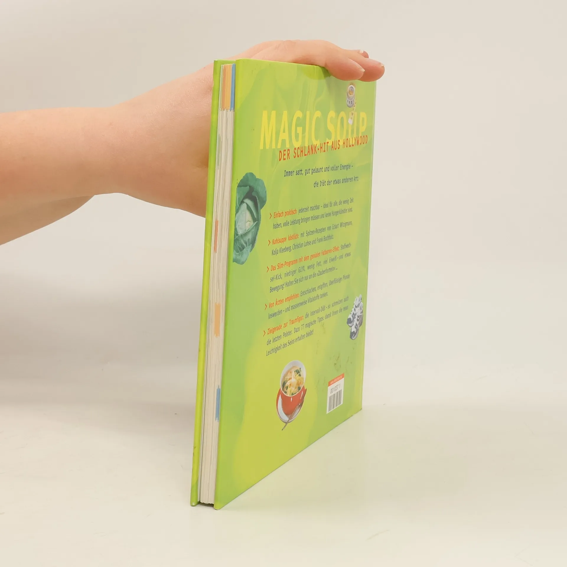 Das Slim-Geheimnis der Models und Promis: die magische Kohlsuppe. Viele Ärzte und Heilpraktiker empfehlen die "cabbage-soup" nicht nur zum Abnehmen, sondern auch als Immundiät, zur Stärkung der Abwehrkräfte. Verfeinert von Eckart Witzigmann und anderen Starköchen ist sie nicht nur köstlich, sondern auch praktisch: Ein Rezept für eine Woche! Dazu ein magisches Wochenprogramm mit Fitness- und Wellness-Tipps: Vitalstoffe, die im Schlaf Fett verbrennen, da Geheimnis des Zitronenwassers oder warum im Zaubertrank von Mirakulix das Eiweiß nicht fehlen darf, welche Gemüse sonst noch glücklich machen und nicht zuletzt, warum Kohl wahre Wunder vollbringt.