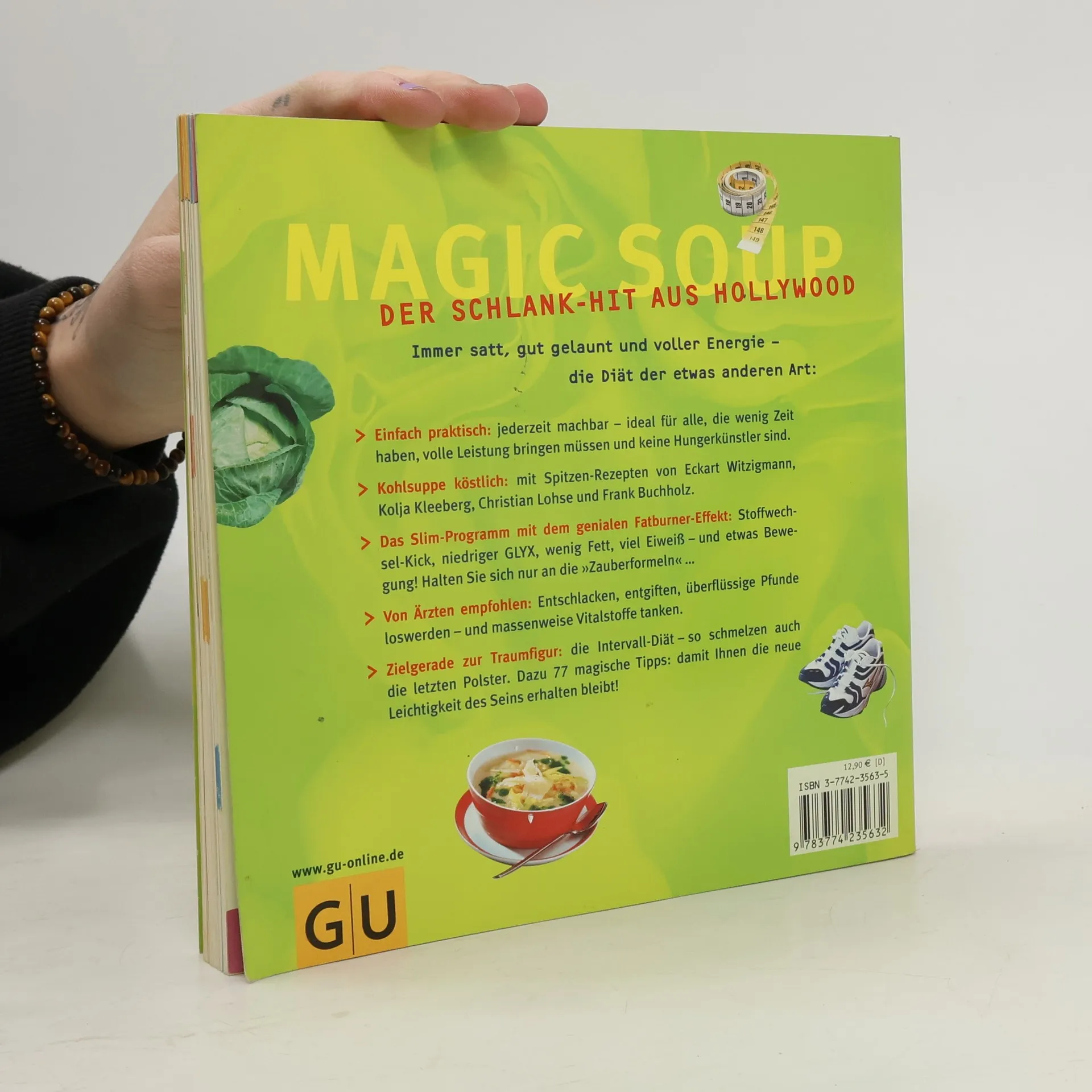 Mit Kohlsuppe lässt sich prima abnehmen. Sie ist gesund und schmeckt auch noch gut. Erfolgsautorin Marion Grillparzer erklärt in ihrem neuen Buch genau, wie die "magische Diät" funktioniert (niedriger GLYX, wenig Fett, viel Eiweiß). Die Sterneköche Witzigmann, Kleeberg, Lohse und Buchholz liefern die besten Kohlsuppenrezepte. Dazu kommen noch neue Rezepte aus aller Welt, damit einem bei der 7-Tage-Diät bestimmt nicht langweilig wird. Wer noch mehr Pfunde loswerden will, für den gibt es die ebenfalls 7 Tage dauernde Intervall-Diät, bei der abwechselnd Kohlsuppe und andere leckere Fatburner-Gerichte gegessen werden.