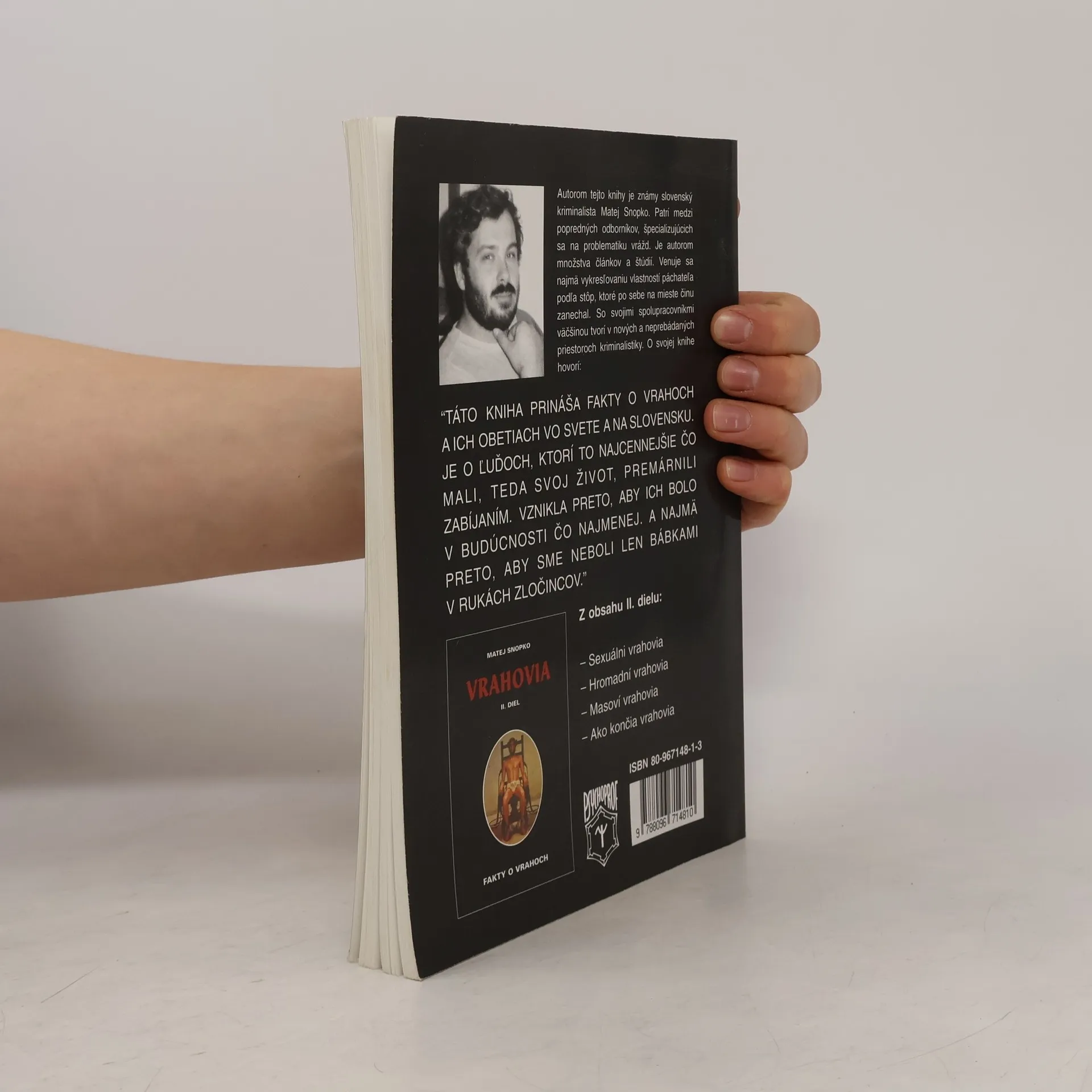 Autorom tejto knihy je známy slovenský kriminalista Matej Snopko. Patrí medzi popredných odborníkov, špecializujúcich sa na problematiku vrážd. Je autorom množstva článkov a štúdií. Venuje sa najmä vykresľovaniu vlastností páchateľa podľa stôp, ktoré po sebe na mieste činu zanechal. So svojimi spolupracovníkmi väčšinou tvorí v nových a neprebádaných priestoroch kriminalistiky. O svojej knihe hovorí: "Táto kniha prináša fakty o vrahoch a ich obetiach vo svete a na Slovensku. Je o ľuďoch, ktorí to najcennejšie čo mali, teda svoj život, premárnili zabíjaním. Vznikla preto, aby ich bolo v budúcnosti čo najmenej. A najmä preto, aby sme neboli len bábkami v rukách zločincov." (zadná strana obálky knihy)