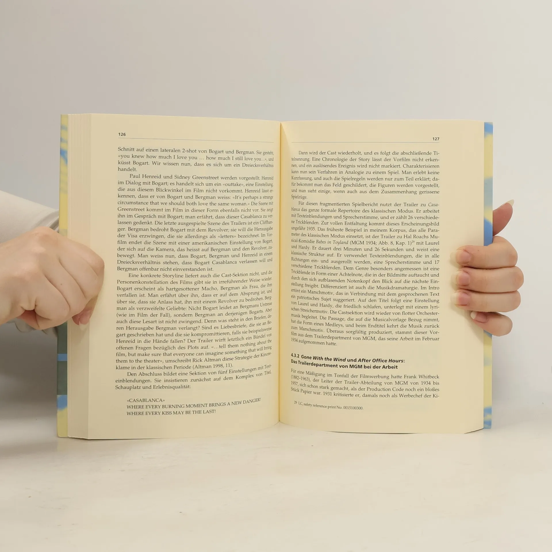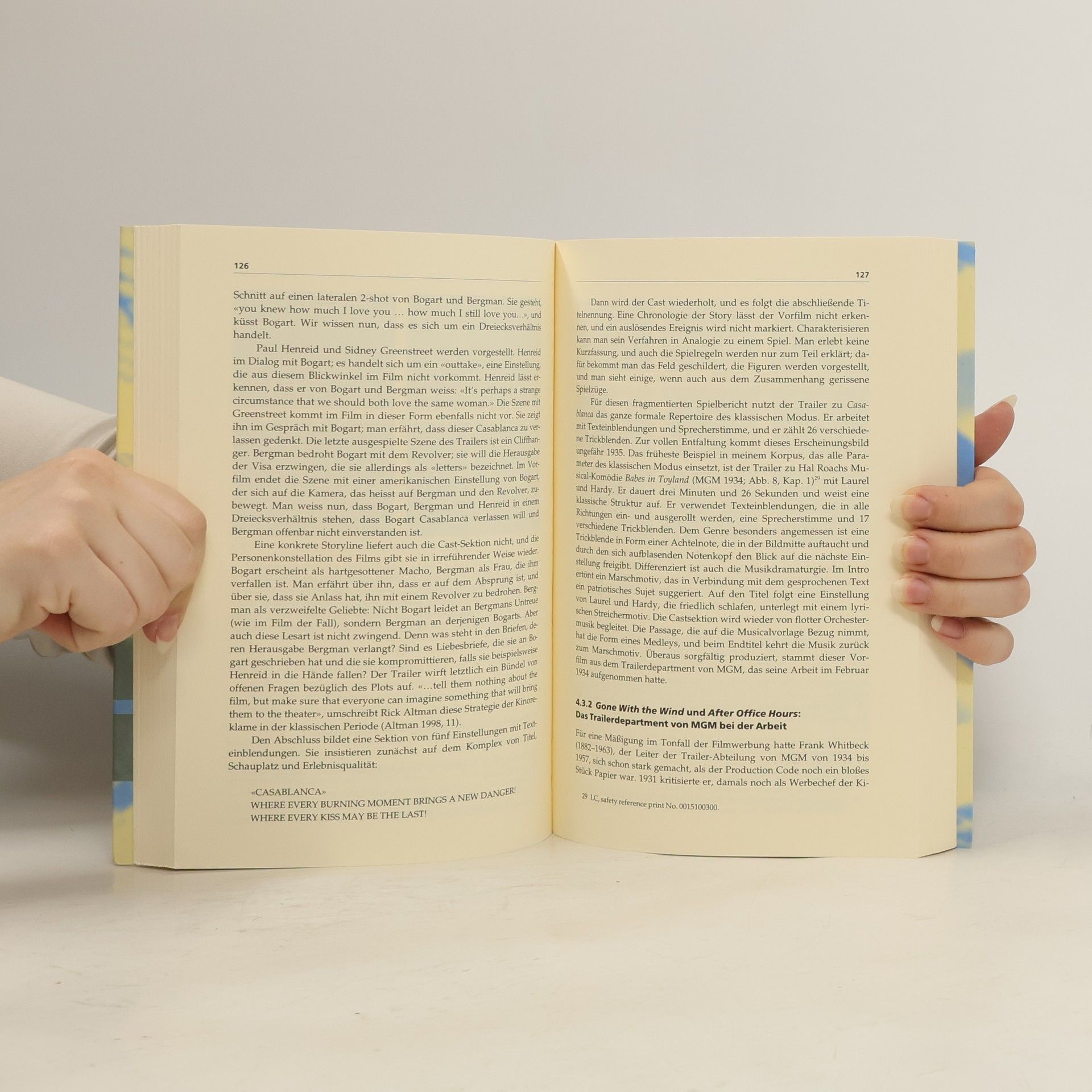 Eine originelle und meines Erachtens bislang einmalige Annäherung an die Geschichte des Films gelingt Vinzens Hediger mit seiner Geschichte des amerikanischen Filmtrailers. Hediger widmet sich den unterschiedlichen Möglichkeiten der Trailer-Werbung und stellt informationsreich und auch den Laien neugierig machend grafische Finessen und Erzählstrukturen dieser Werbespots vor. (2) (LK/PB: Grumpe-Aßmann)