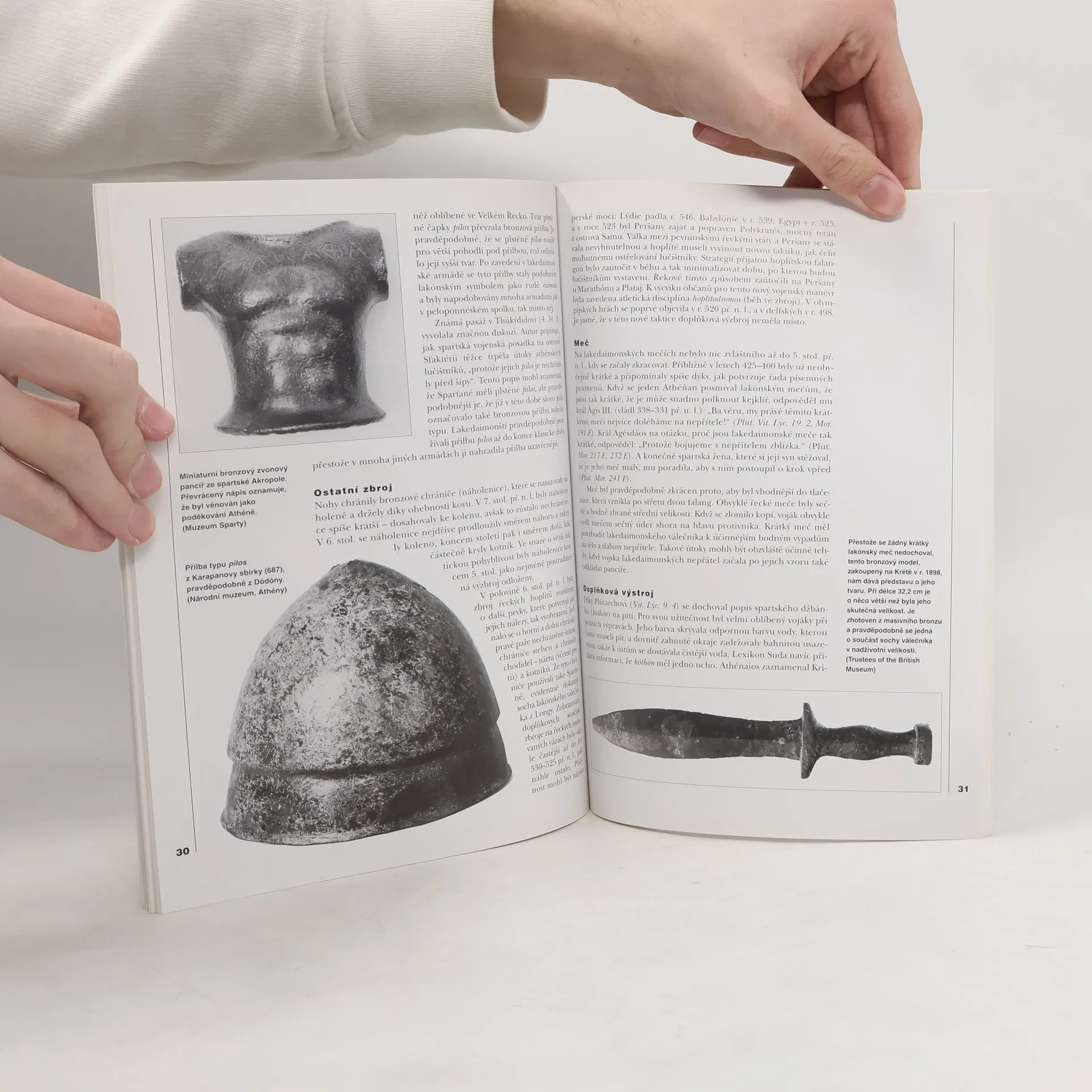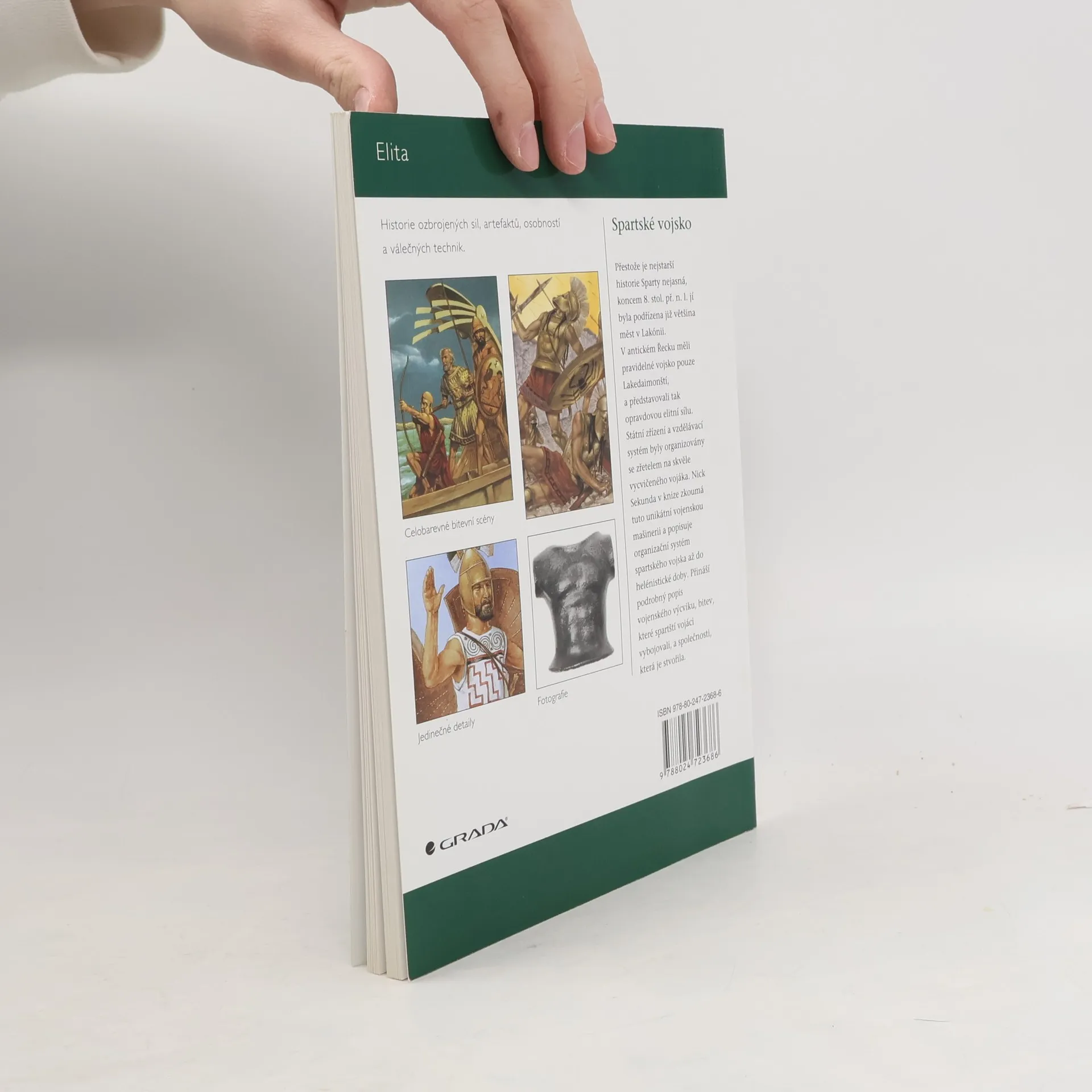Vybavení, výzbroj a organizace starověkého spartského vojska. Polský historik N. Sekunda věnoval svou práci popisu starověkého spartského vojska. Čerpal z řady historických pramenů a také dochovaných bronzových a kamenných sošek, stél, reliéfů i jiných archeologických nálezů. Popisuje výcvik spartských chlapců, organizaci hoplítského vojska, vojenský oděv, obuv i účes. Zvláštní pozornost je věnována výzbroji vojáků - kopím, štítům, přilbám, mečům. Výklad doprovázejí fotografie archeologických nálezů a ilustrace (historické rekonstrukce) spoluautora knihy R. Hooka. V závěru literatura a rejstřík.