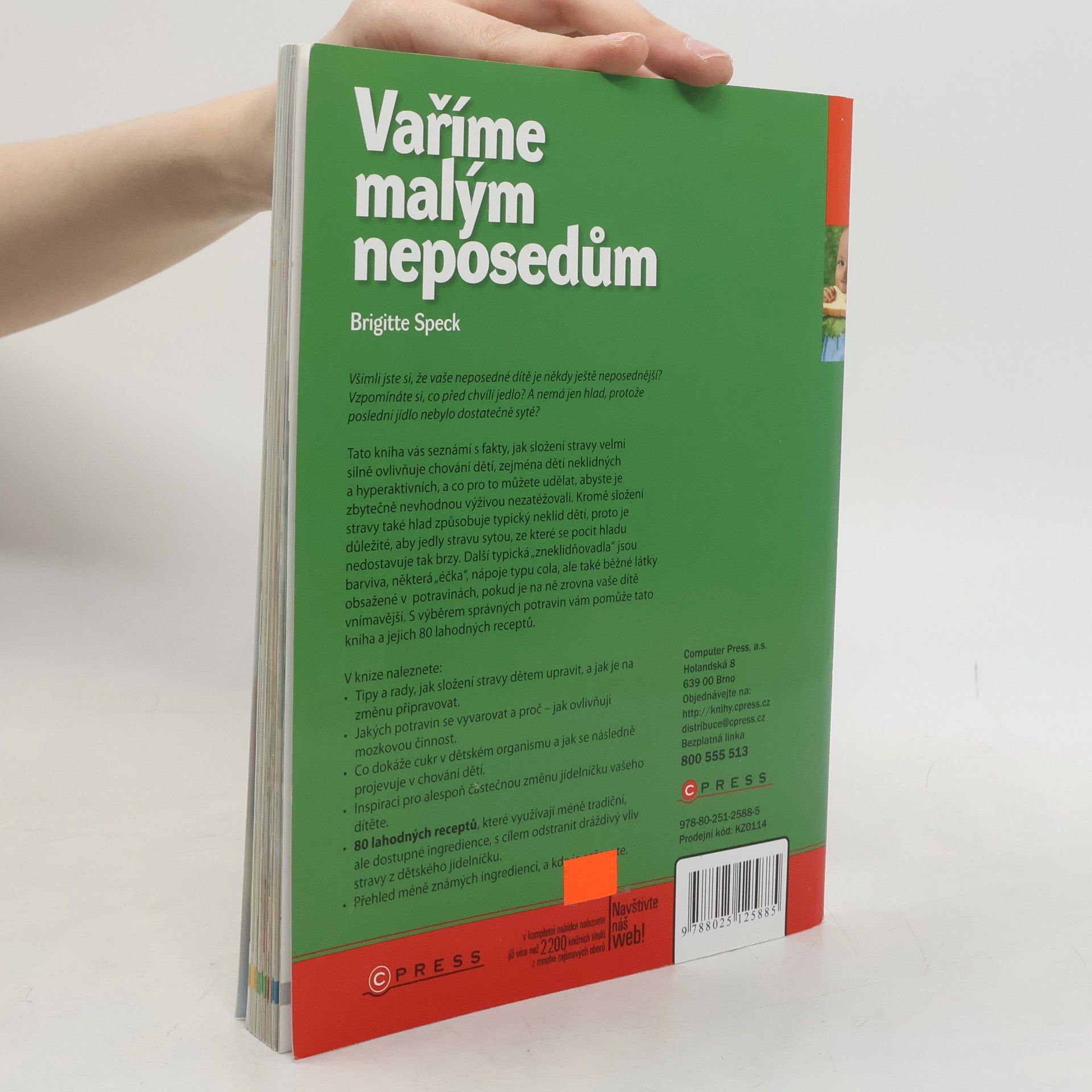 Podtitul: Zdravá a zklidňující strava pro hyperaktivní a neklidné děti Příručka pro rodiče hyperaktivních dětí shrnuje základní poznatky o působení stravy na chování dítěte i rady, jak vhodnou stravou toto chování příznivě ovlivnit. První část se zabývá souvislostí výživy s mozkovou činností a probírá jednotlivé potravinové složky z tohoto hlediska. Větší část knihy pak nabízí desítky receptů na pokrmy, které jsou vhodné pro usměrnění projevů hyperaktivního chování u předškoláků i školáků: pomazánky, polévky, svačinky, vegetariánské pokrmy a přílohy, maso a ryby, ovocné štávy, dezerty a kompoty a chéb i pečivo vlastní výroby.