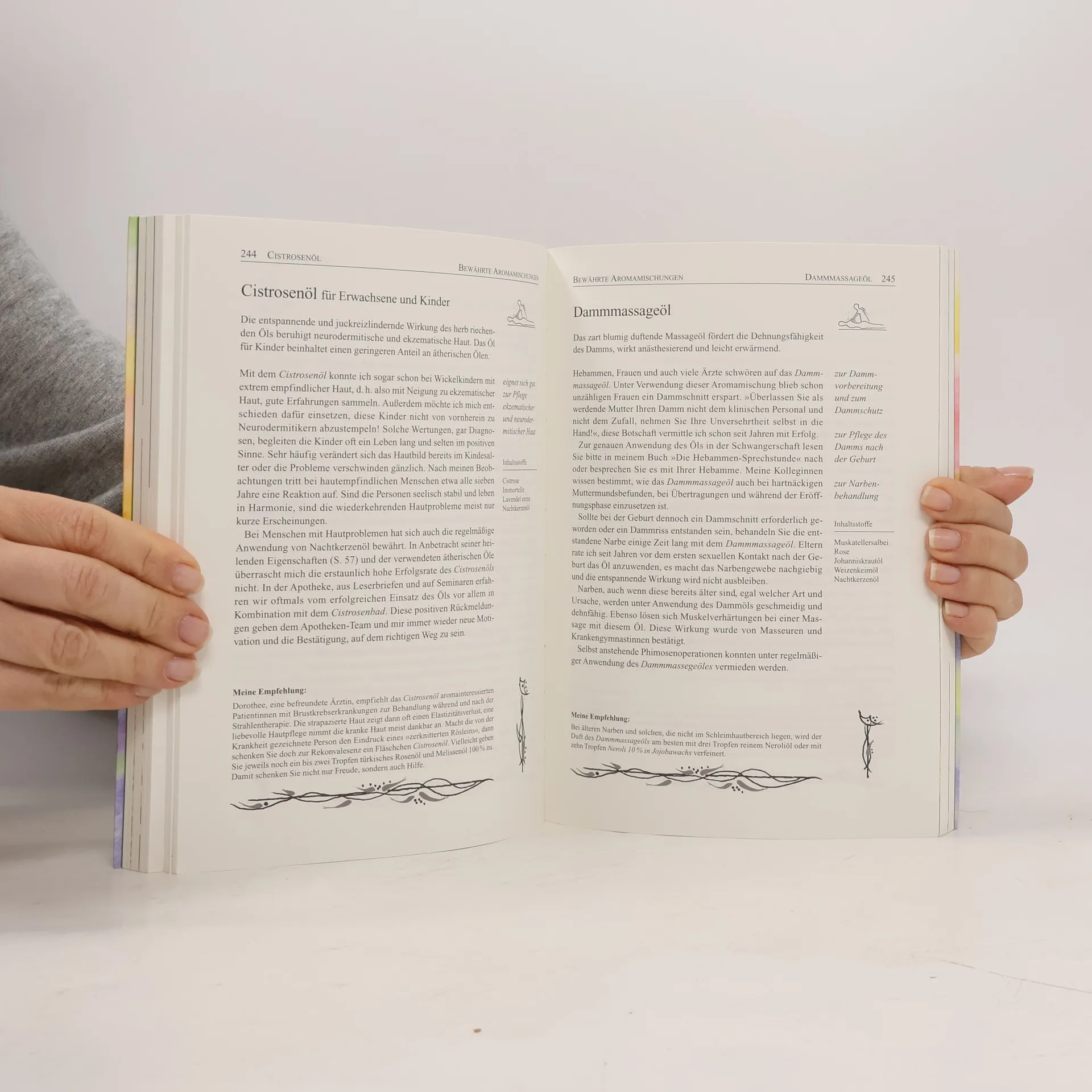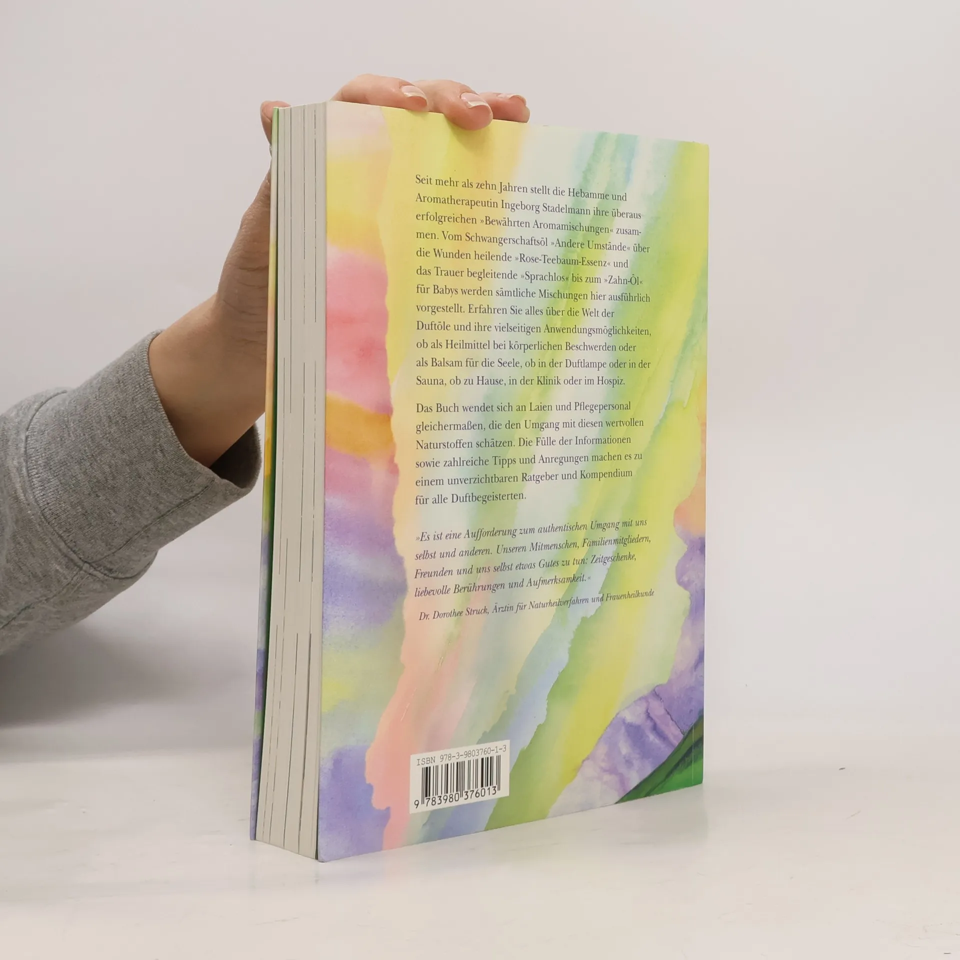 Erfahren Sie alles über die Welt der Duftöle und ihre vielseitigen Anwendungsmöglichkeiten. Die Hebamme und Aromatherapeutin Ingeborg Stadelmann präsentiert erstmals ihre „Bewährten Aromamischungen“, darunter das Schwangerschaftsöl „Andere Umstände“, die heilende „Rose-Teebaum-Essenz“, das trauerbegleitende „Sprachlos“ und das „Zahn-Öl“ für Babys. Das Buch richtet sich an Laien und Pflegepersonal und bietet eine Fülle an Informationen, Tipps und Anregungen, die es zu einem unverzichtbaren Ratgeber für Duftbegeisterte machen. Es ermutigt zu einem authentischen Umgang mit uns selbst und unseren Mitmenschen, indem es zur Schaffung von Zeitgeschenken, liebevollen Berührungen und Aufmerksamkeit anregt. In acht großen Kapiteln behandelt das Buch die Welt der Gerüche, Hydrolate, fette Pflanzenöle, ätherische Öle und deren Wirkungen, bewährte Aromamischungen, die Herkunft und Qualität ätherischer Öle sowie deren Handhabung und Dosierung. Die übersichtliche Gestaltung mit Kolumnentiteln und Untertiteln erleichtert die Orientierung. Empfehlungen der Autorin inspirieren zu persönlichen Mischungen, und zu jedem Öl werden Wirkungsbeschreibungen und Anwendungshinweise gegeben. Zudem enthält das Buch acht Hochglanzbildtafeln.
